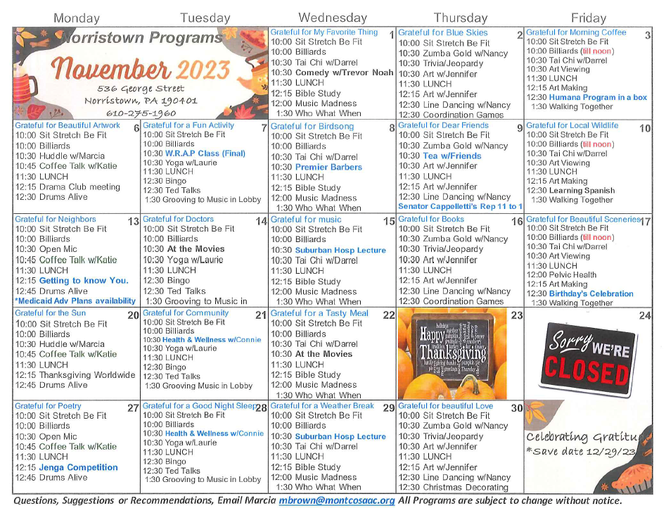 Learn more about what's happening at Montco SAAC, Norristown and Ambler locations! | |