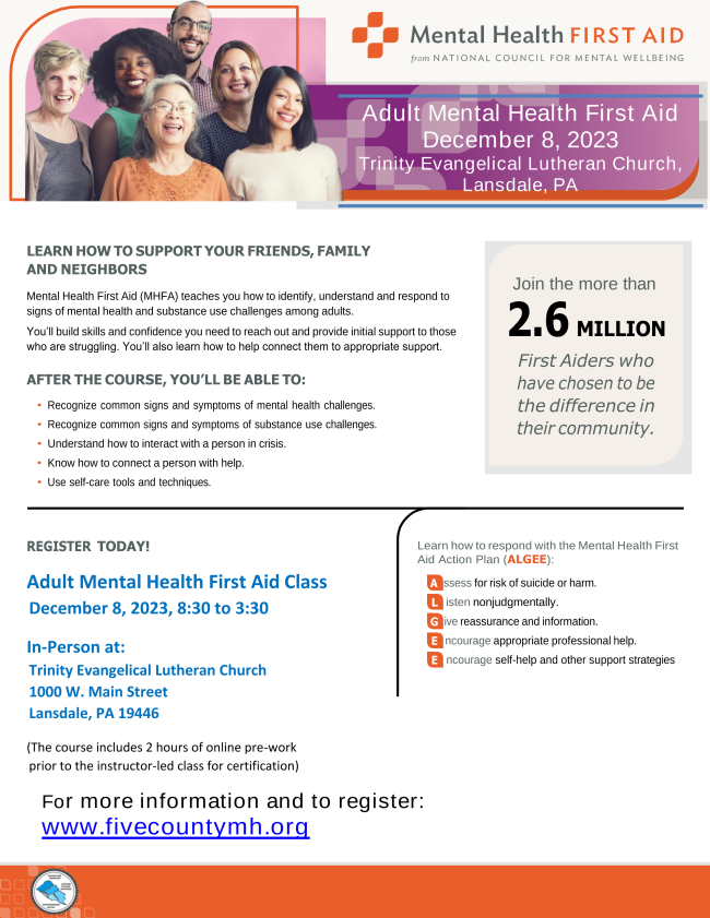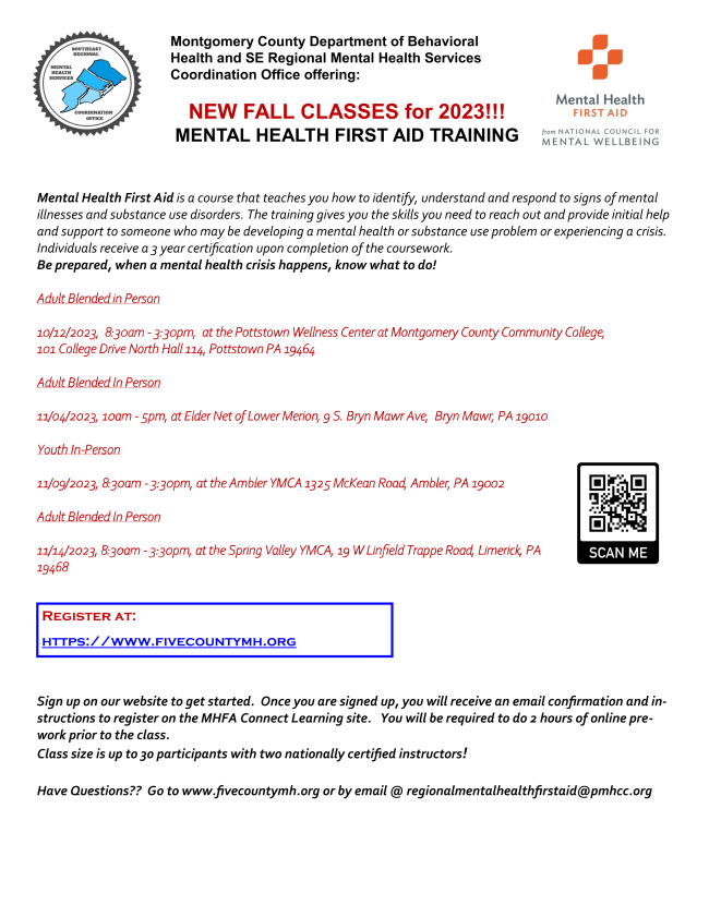 Since the National Council for Mental Wellbeing brought Mental Health First Aid (MHFA) to America in 2008, Instructors have trained over 3 million First Aiders from all 50 states and U.S. territories. But that’s just the beginning! The National Council's new goal is to train one out of every 15 people in America in MHFA, ensuring that everyone has a close friend they can turn to when experiencing a mental health or substance use challenge. Become a First Aider! Participate in one of these upcoming trainings, and share the flyers with your colleagues. | |
