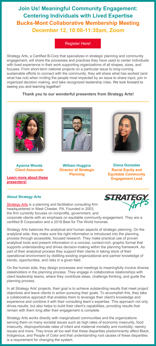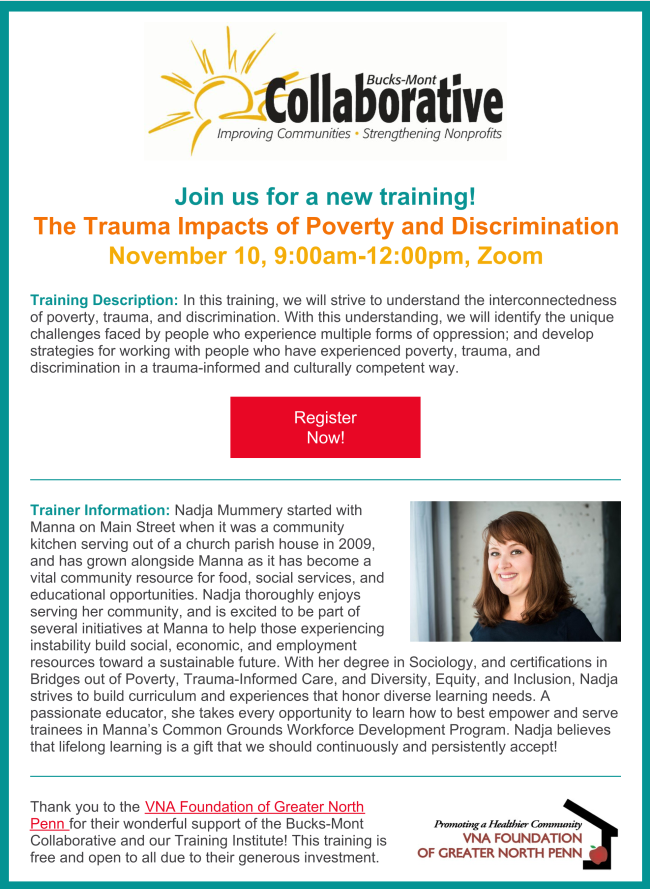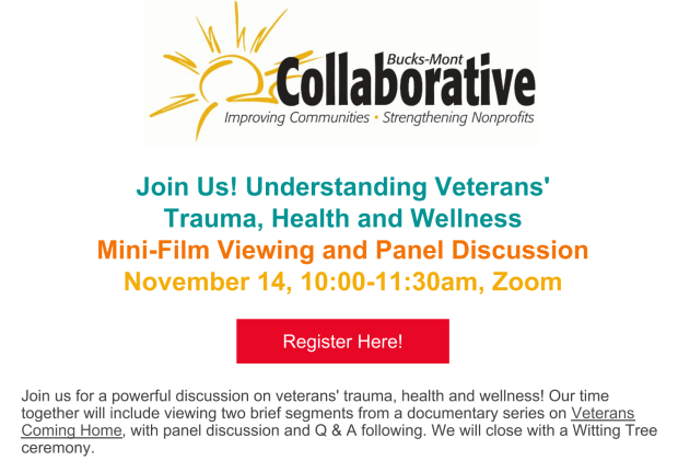 Please continue to keep us informed of what's happening with you in Bucks and Montgomery Counties. The information here comes from you, with links to our website for more complete information and resources. Send your events and updates to Kristyn: kristyn@bucksmontcollab.org. Thank you!