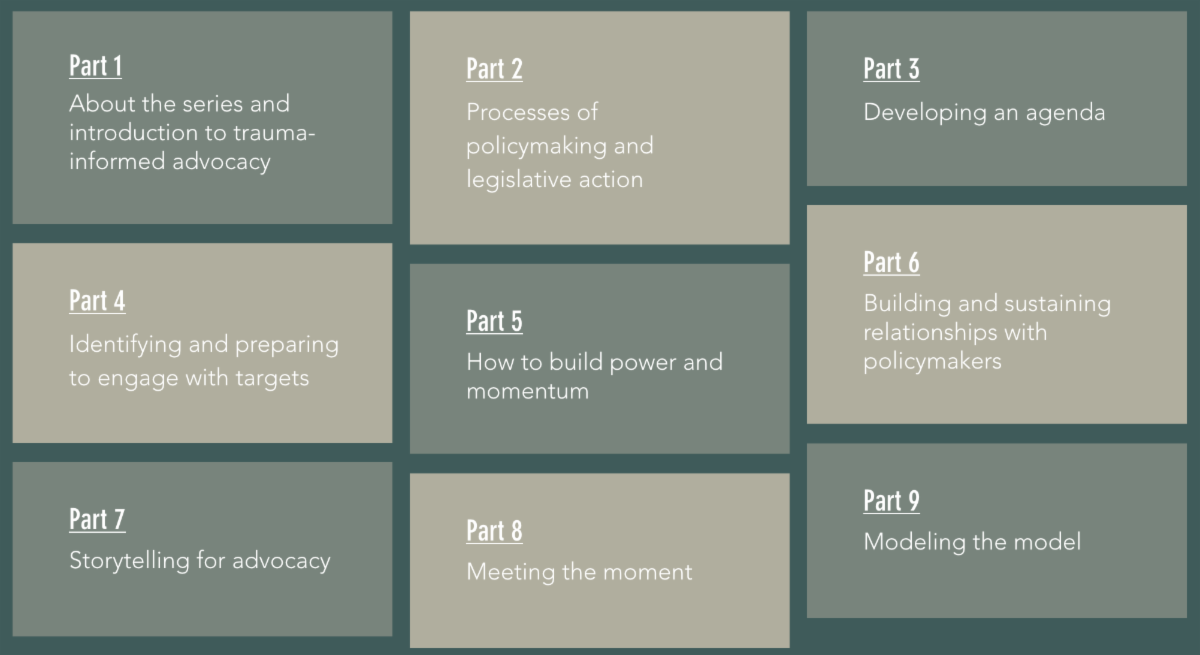 Thank you to CTIPP for sharing this asynchronous 9-part advocacy series developed by Whitney Moris. This asynchronous workshop series teaches skills that model the model and will help you develop into the strongest advocate possible. Each module provides a video, audio transcript, PowerPoint slides, resources, and reflective exercises to support your trauma-informed journey. Learn more!