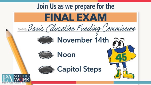 2. Join Children First in Harrisburg Tuesday, Nov 14th at Noon for a rally on the Capitol steps! Gather on the front steps of the Capitol (rain or shine) with a giant report card to tell Governor Shapiro and BEFC that their final report must include a clear and thorough calculation of how much each school district needs to meet the constitutional obligation to our student and a reasonable timeline for the implementation of their plan.
