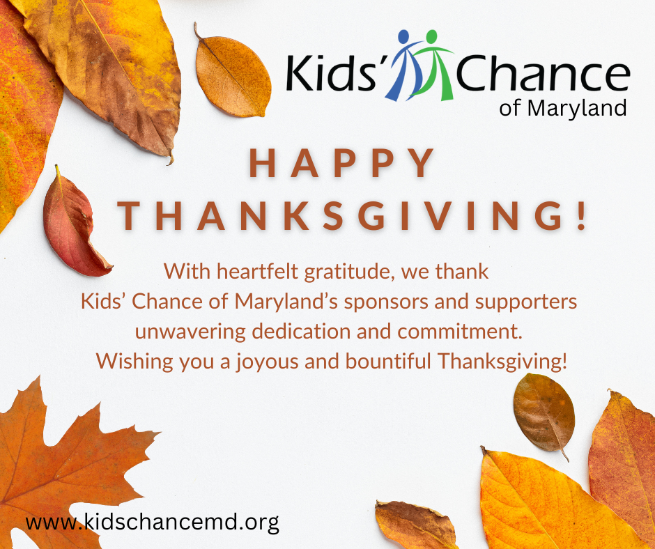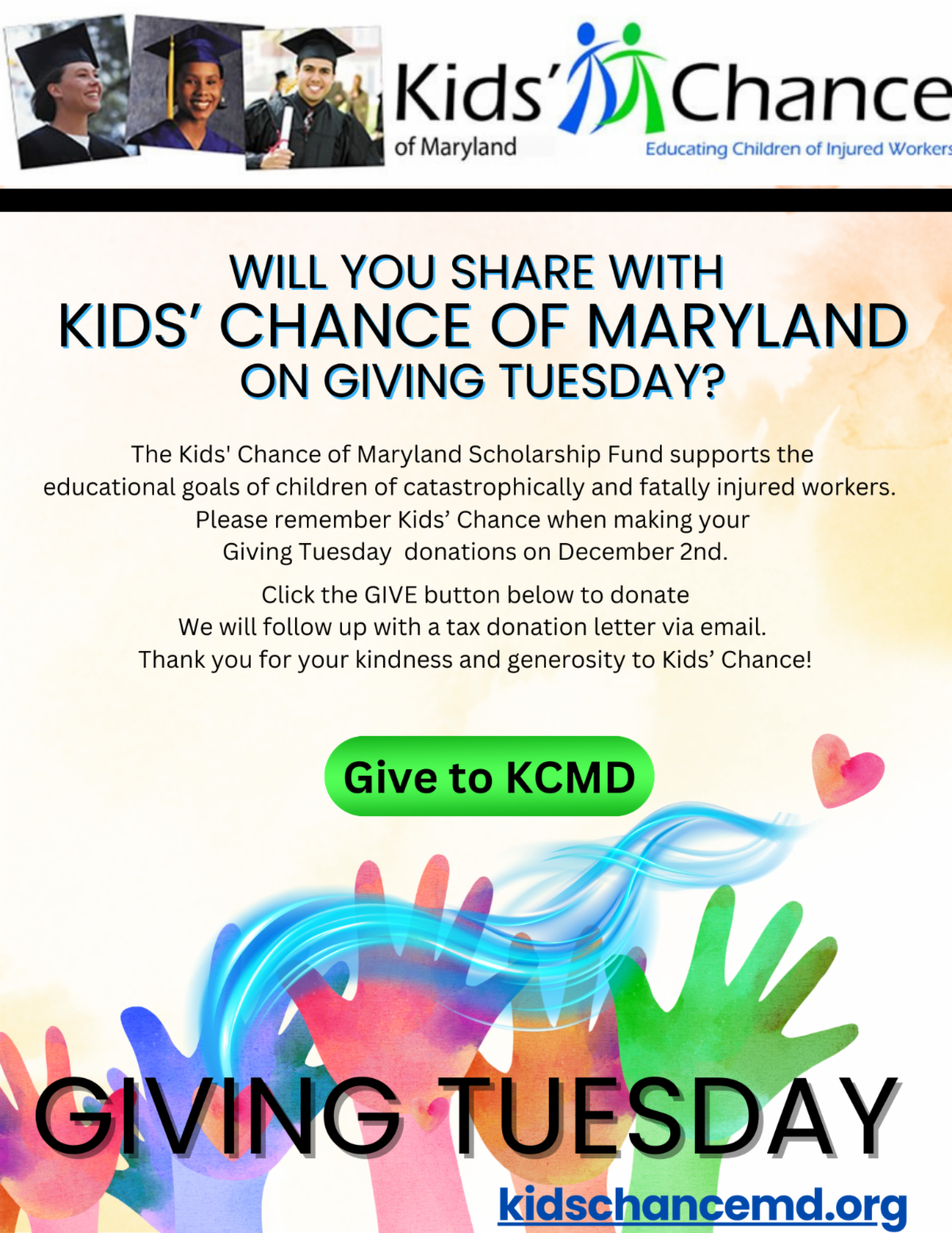 As we celebrate gratitude this week, we also look forward to Giving Tuesday on December 2nd, 2025. This global day of generosity is an opportunity to extend the spirit of Thanksgiving by making a gift to Kids’ Chance of Maryland. Every donation, large or small, helps us provide scholarships that change lives.