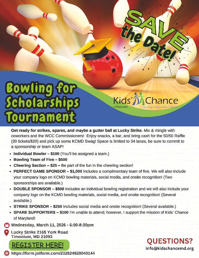 Sponsorship of Kids’ Chance of Maryland is more than a logo on an event banner—it’s a direct investment in the future of our students. Sponsors receive recognition across our events and communications, but the true benefit is knowing that your support provides scholarships, stability, and hope for families navigating difficult circumstances. Together, we are building a legacy of opportunity.