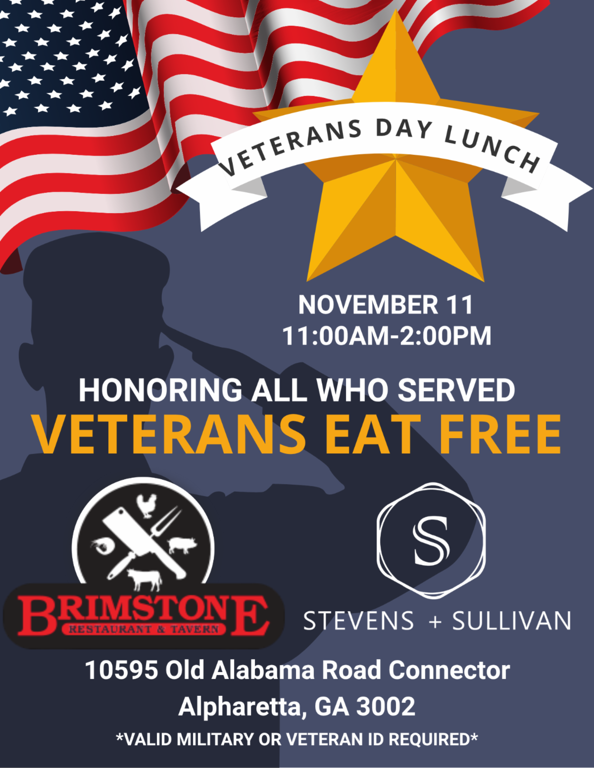 Tuesday, November 11, 11:00 am to 2:00 pm, Brimstone Restaurant and Tavern 10595 Old Alabama Rd. Connector, Alpharetta, GA 30022. Stevens and Sullivan Law firm offering a free lunch for Veterans.