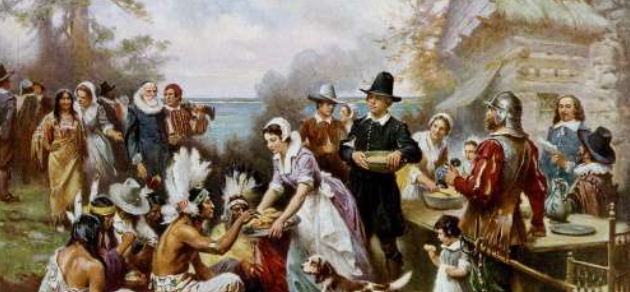 The artist depicts the four women who are serving the meal with smiling faces but that may not have been the case. Eleanor Billington, Elizabeth Hopkins, Mary Brewster, and Susanna White Winslow, the only women to survive the first deadly winter that killed half of Plymouth Colony, probably didn’t feel all that thankful when their husbands invited 90 guests, all Wampanoag men, to eat with them without the aid of kitchens, ovens, wheat, spices or butter. Remarkably, the four women managed to feed 143 people. The meal itself – or rather meals, because they stayed for three days – served as more of a harvest celebration than a Thanksgiving.