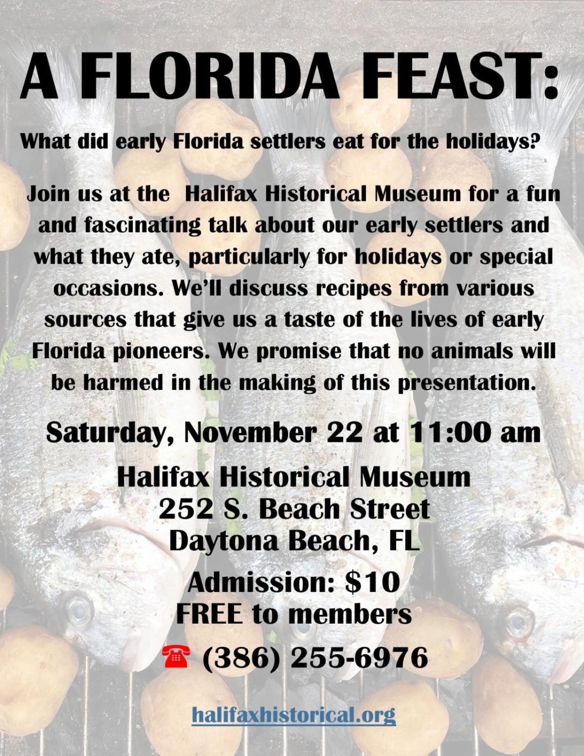 What did early Florida Settlers eat for the holidays? Saturday, November 22nd, at 11:00am at the museum.