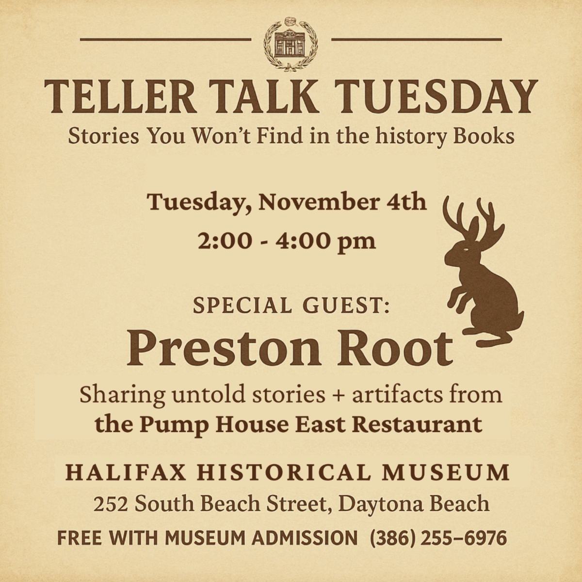 This month’s gathering will feature Preston Root, whose family owned and operated the beloved Pump House East on Ridgewood Avenue. Inspired by our recent article “A Quick Pause and a Look Back at the Original Pumphouse,” Preston will be sharing never-before-heard stories, bringing original artifacts—including old menus—and treating us all to a special surprise connected to the Pumphouse’s colorful history