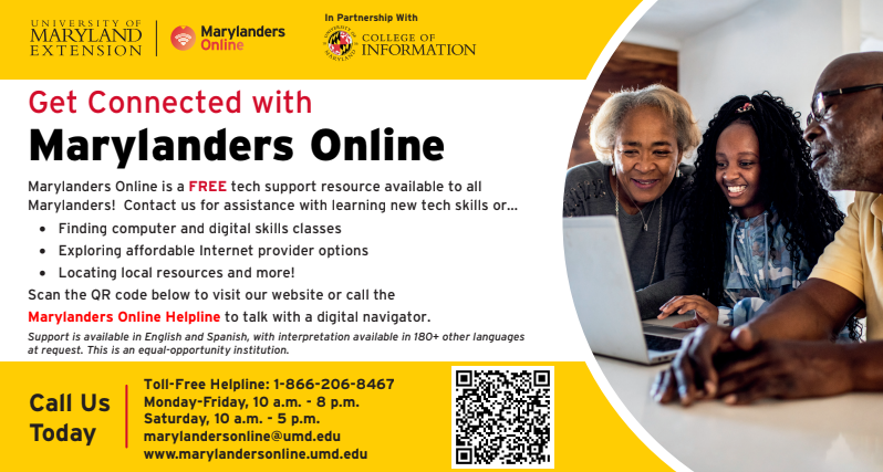 The Marylanders Online Helpline is a free service staffed by a team of trained digital navigators who offer personalized, no-cost computer help, tech support, and connections to local resources - all by phone or email.