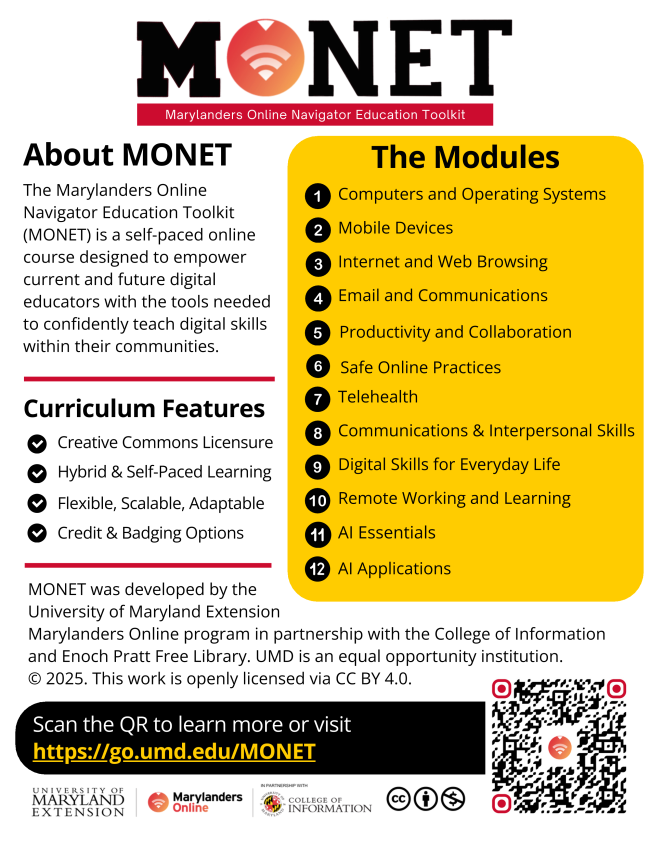 The Marylanders Online Navigator Education Toolkit (MONET) is a train-the-trainer curriculum developed by the UME Marylanders Online and the UMD College of Information (INFO). MONET is designed to empower community-serving agencies to offer localized digital navigation services through 12 scalable hybrid modules.