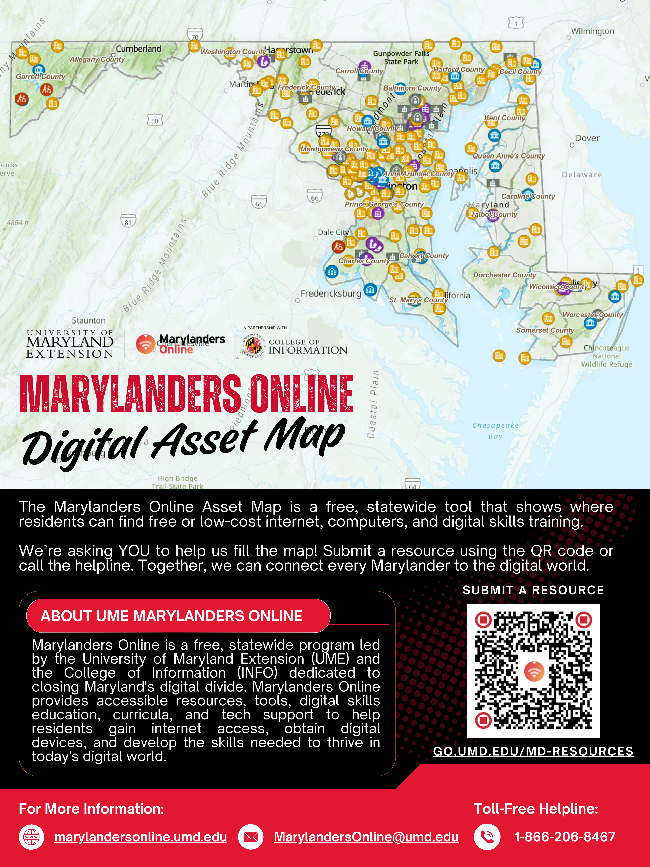 UME Marylanders Online is building a statewide digital asset map to share the many resources that are available to the community. If you are an organization that provides digital skills classes, wi-fi, tech support, training, devices, or other digital services, please share your resources for inclusion in Maryland’s digital asset map.