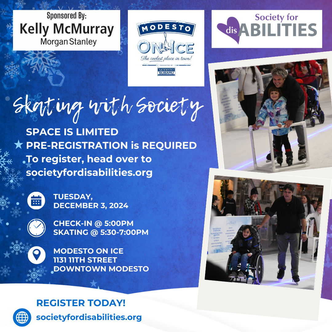Join us at Modesto on Ice for a family skate night especially for Society’s clients on December 3 from 5:30 to 7pm. We are most grateful to our sponsors Kelly McMurray and Ray Ruiz!