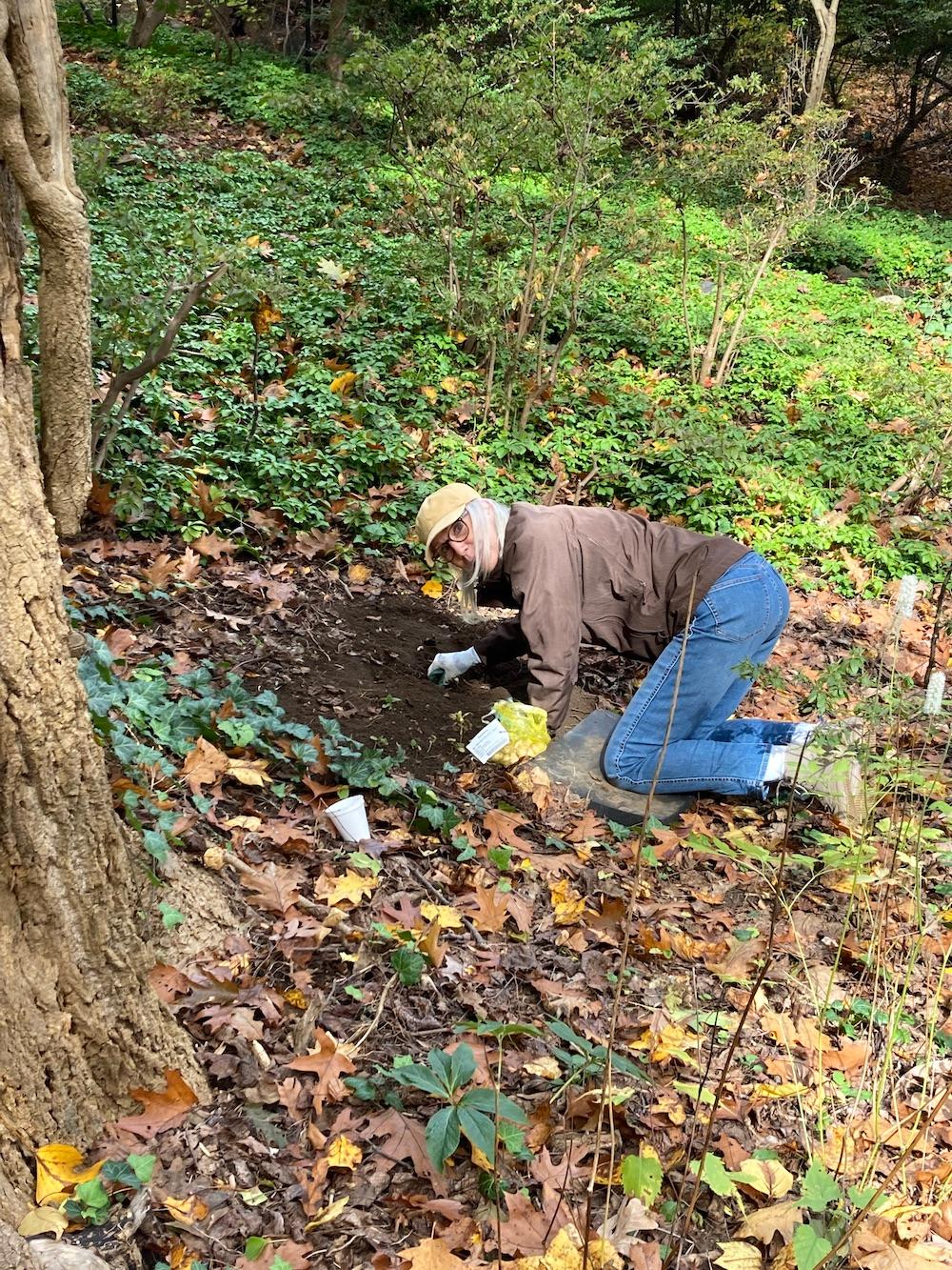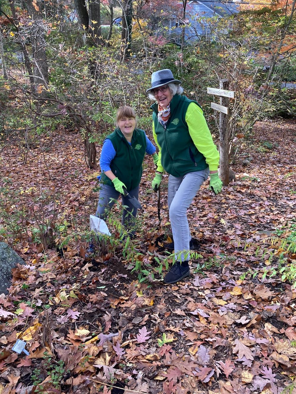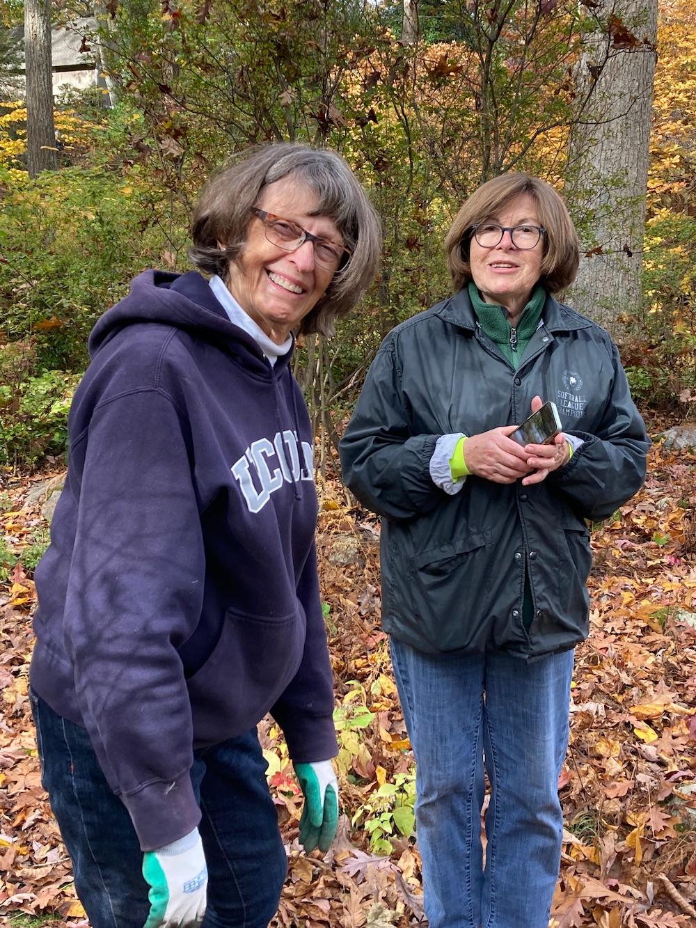 Despite the chain link fencing and construction close by, Center Bell triangle stewards, Kathleen and Peter Murphy and Betsy Bilus, weeded, pruned, and planted on a beautiful October day.