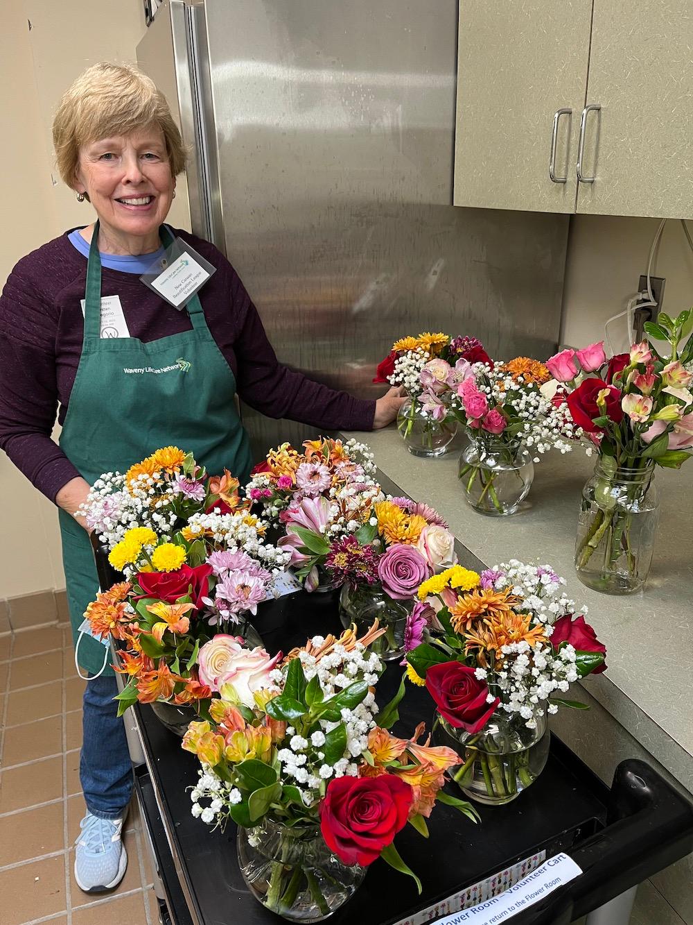 Lois Sandberg (left) is a first-time volunteer with Waveny Care Center flower arranging. Lois created some beautiful arrangements with Betsy Bilus this month. Working with donated flowers requires flexibility in trying different color combinations and our volunteers are enjoying the challenge.