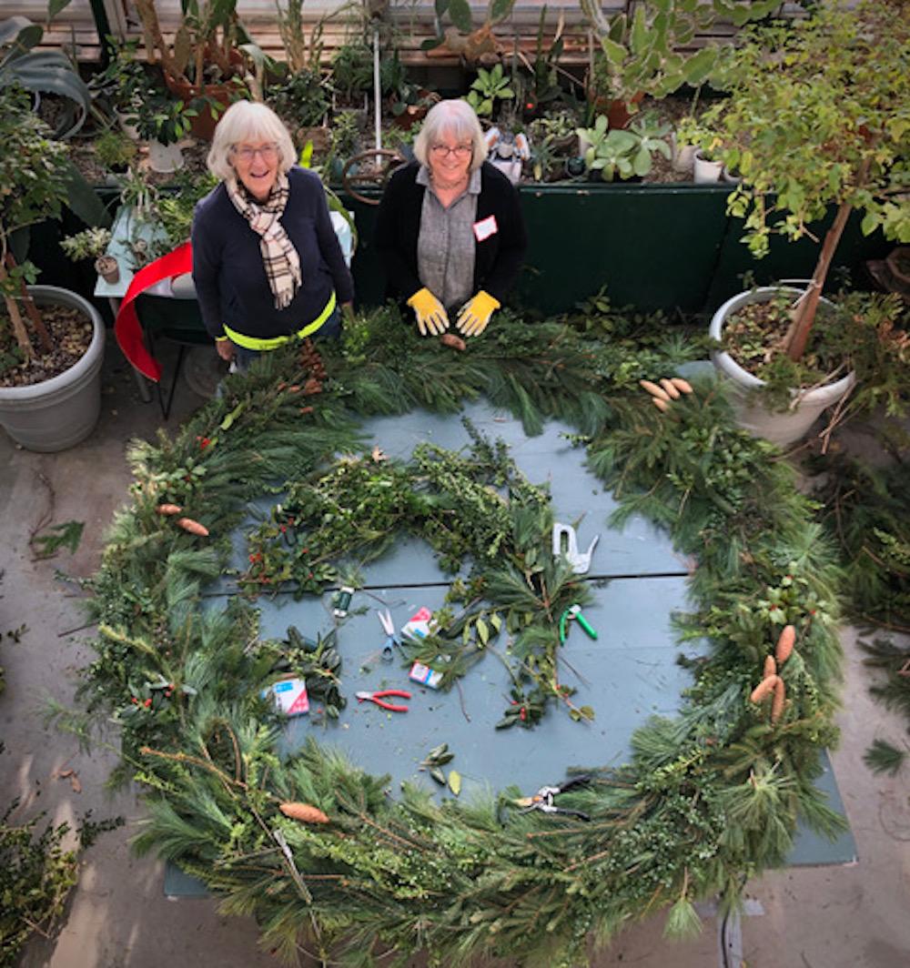 Susan Bergen, Lois Himes, and Angela Materna work on a large wreath.