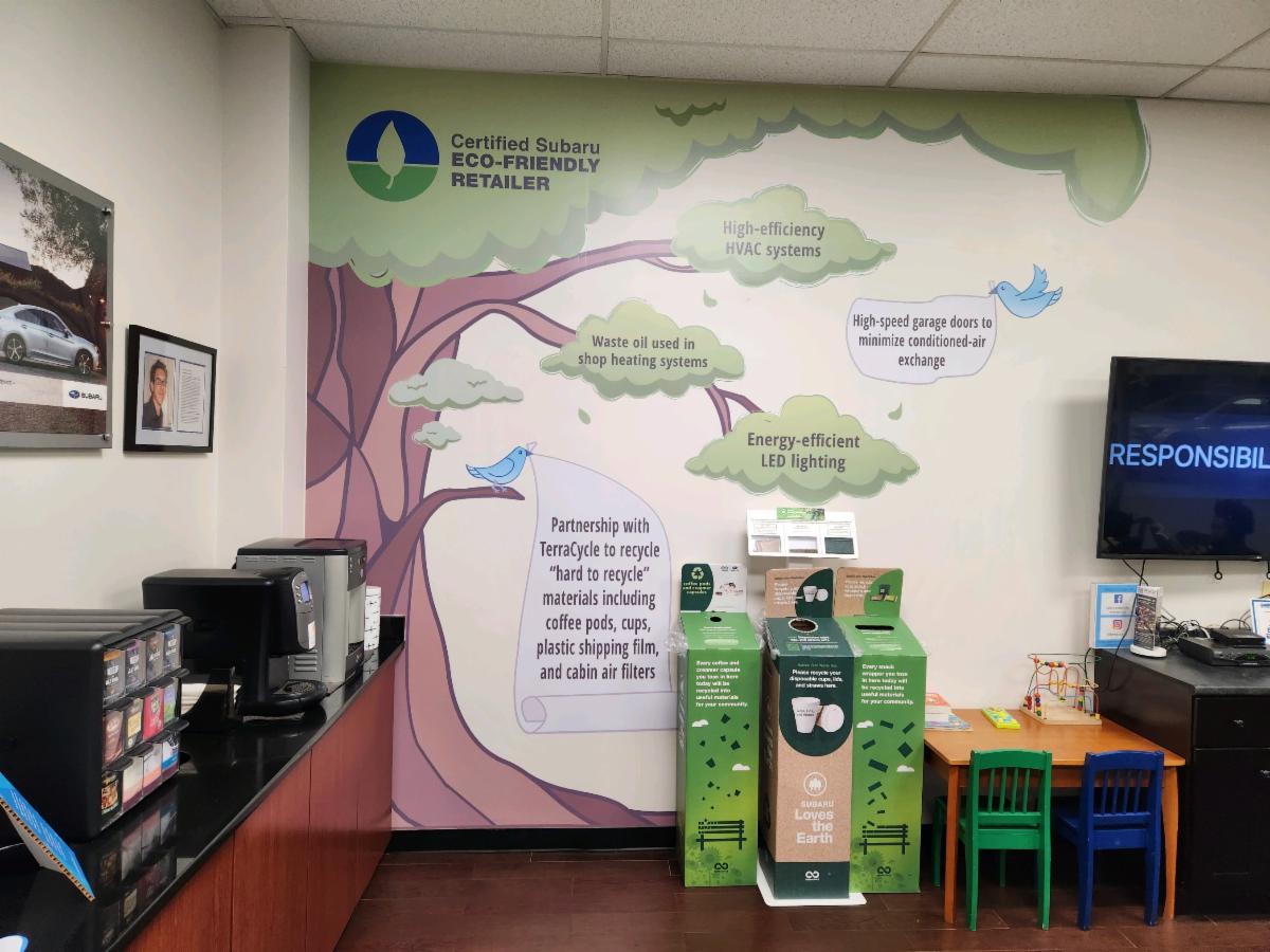 Liberty Subaru, of Emerson, NJ, certainly knows how to get the attention of customers in their customer service waiting room! Retailer Rick DeSIlva, Jr., tasked his daughter, Emily (a high school junior who is considering graphic art as a field of study in college), with creating an eco-display wall for the customer waiting area. The impressive result is a vinyl wall film, highlighting four main bullet points: