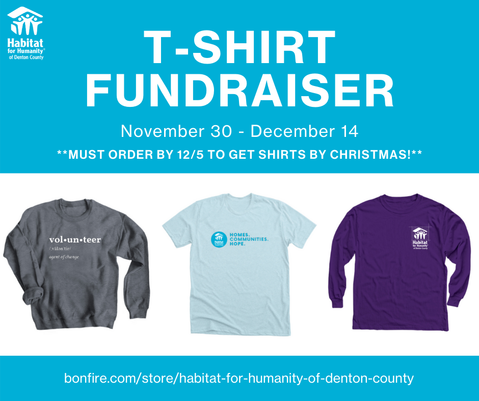 Habitat for Humanity of Denton County's T-shirt Fundraiser is finally here! Visit our online store to choose from 3 designs, 9 shirt styles, and numerous colors, including tees, long-sleeve, hoodies, Comfort Colors, Youth sizes, women's slim-fit, and more. Find the perfect gift for your spouse, children, grandchildren, cousins, friends, coworkers....there's something for everyone! The shirts ship directly to you and the proceeds go directly to Habitat.