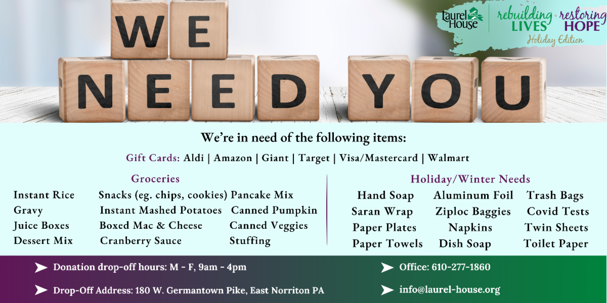 In addition, we are also in search of holiday dinner fixings and other winter needs. Please check out our Holiday Wish List below to see what our most current needs are. If you have any additional questions or would like more information, please contact Emily O’Connell at 610-277-1860 x117 or email at eoconnell@laurel-house.org.