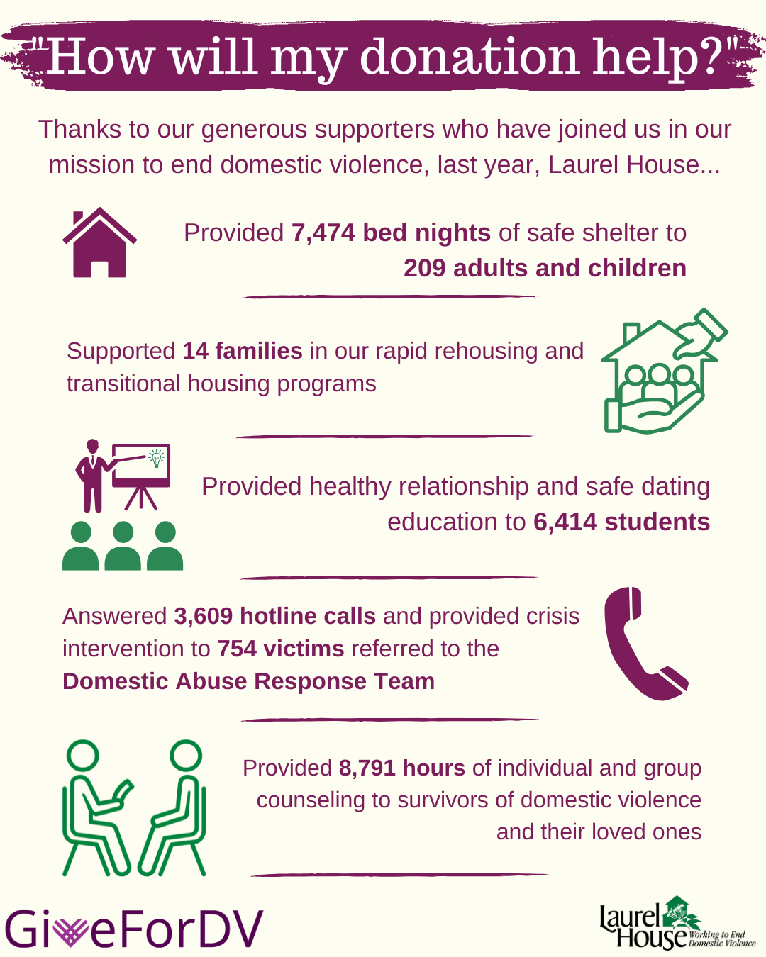 Our goal is to provide $150 in gift cards to each adult and $100 in gift cards per child in each family. If you have questions or are interested in participating, please contact Andrea Devenney at adevenney@laurel-house.org.