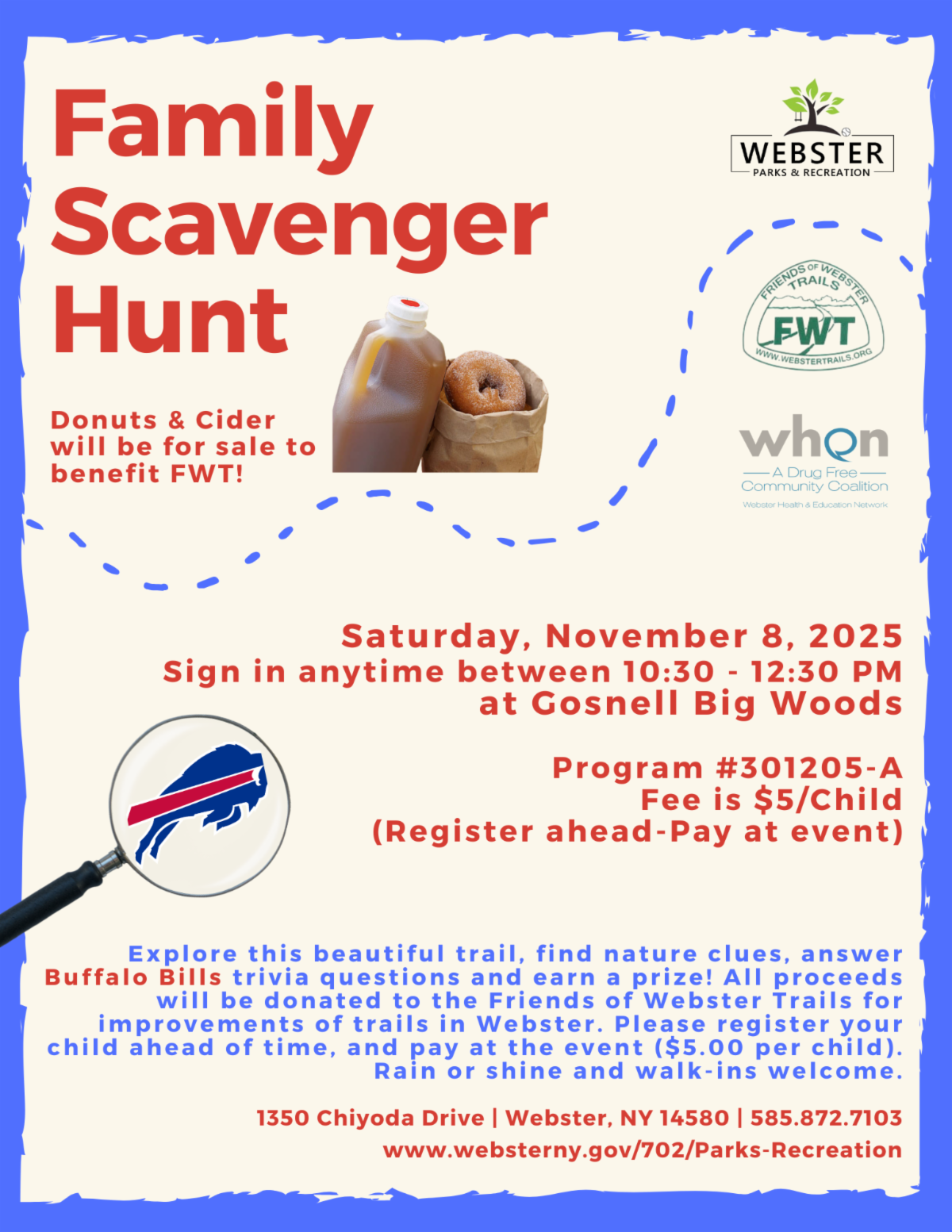 All children completing the scavenger hunt will receive a prize. All proceeds from this program will be donated to the Friends of Webster Trails for maintenance and improvements of the trails in Webster. Registration is encouraged; $5/child due at event.