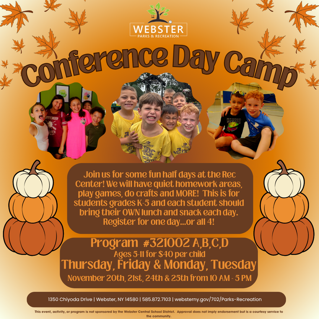 Join us for some fun half days at the Webster Rec Center! Webster Recreation will have quiet homework areas, games, crafts, and more!