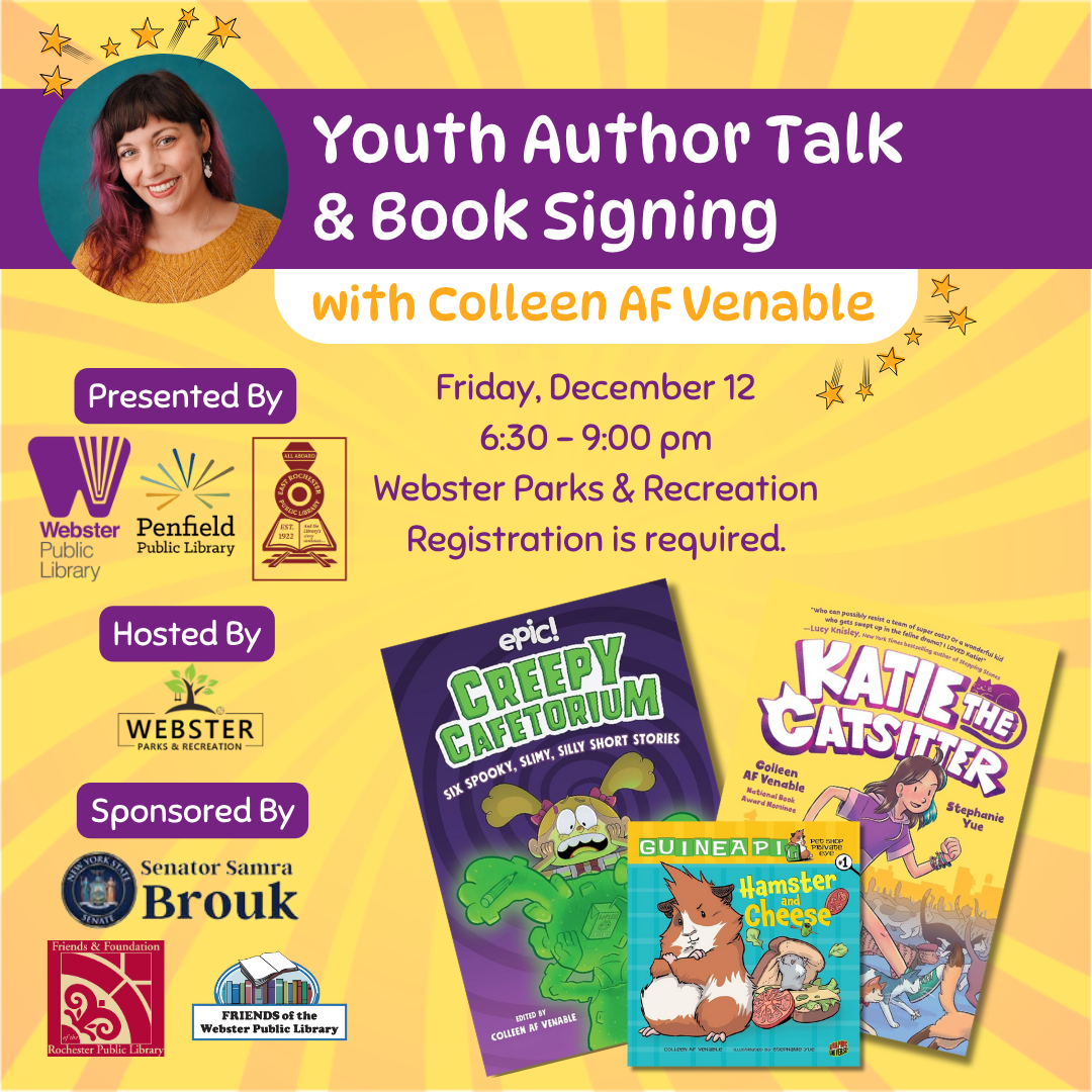 Webster Public Library is pleased to host Colleen AF Venable at 6:00 pm on Friday, December 12 at Webster Recreation Center (1350 Chiyoda Dr, Webster, NY 14580)!