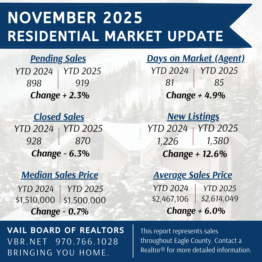 November 2025 market statistics are available for Eagle County residential real estate. Click here or the image below to see an overview of the market.