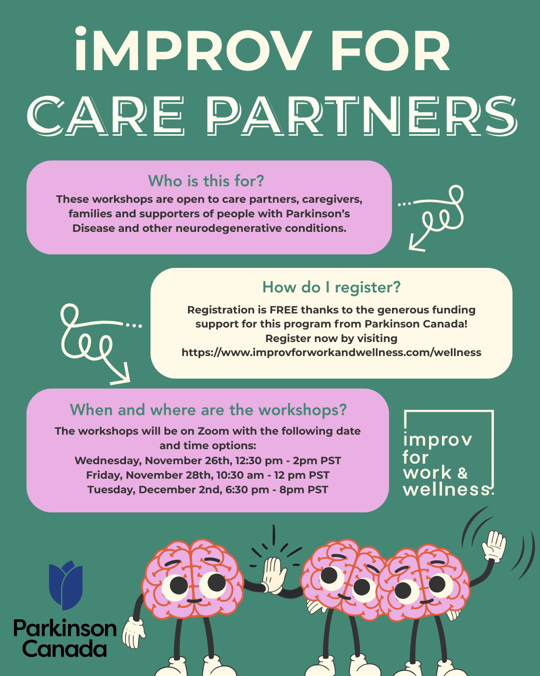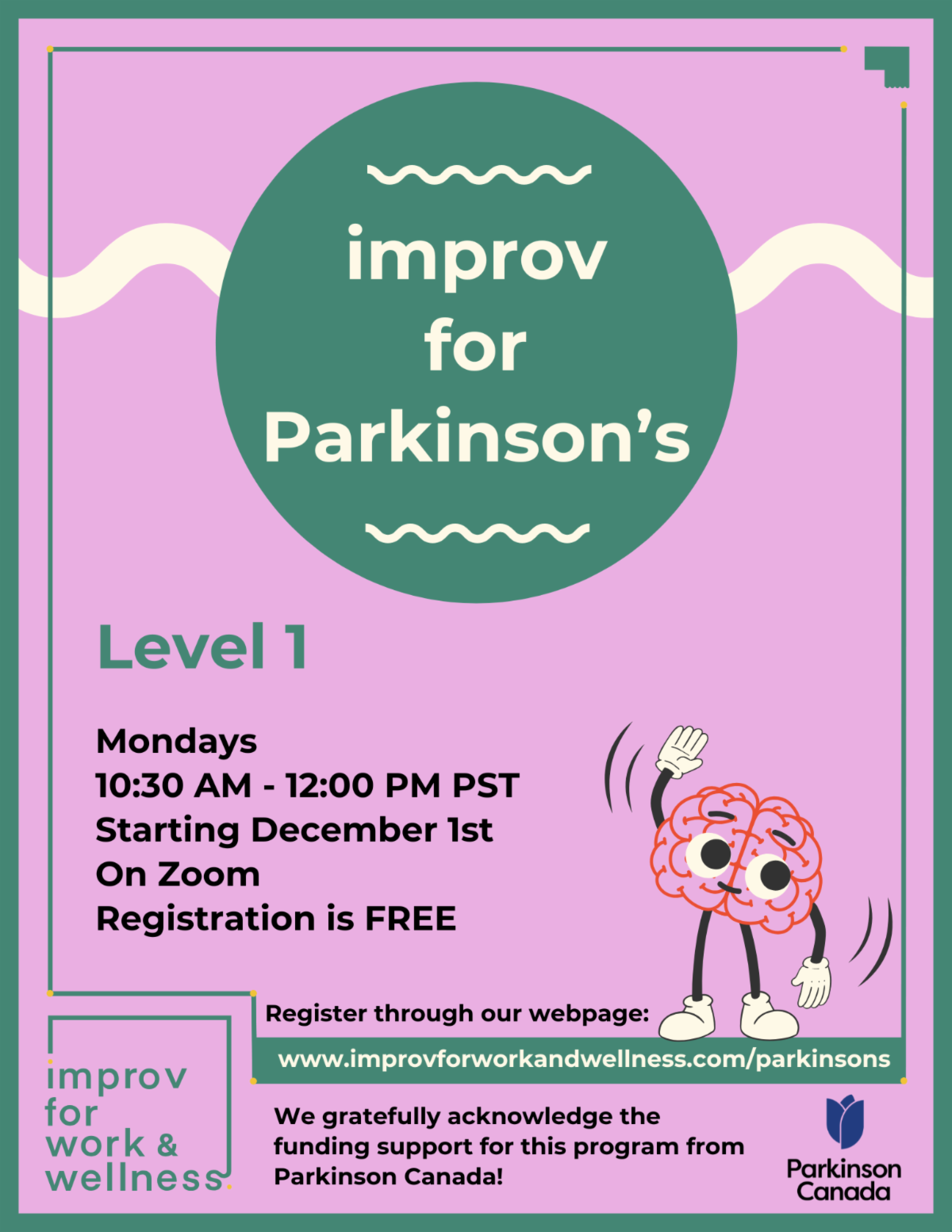 A few sessions of Improv for Parkinson’s and Care Partners hosted by Improv for Work and Wellness, continued into the final week of November and will extend into December and January. Registration for upcoming sessions is open and the next Improv for Parkinson's Level 1 course starts next Monday, DECEMBER 1st at 10:30 am PST | 1:30pm EST - No experience neccessary