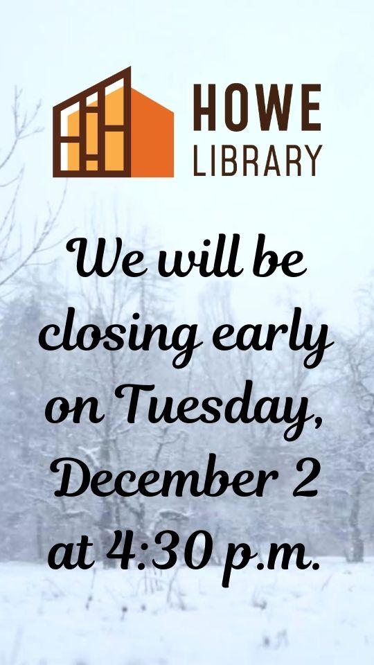 We will be closing early on Tuesday, December 2, at 4:30 p.m. Please call before coming in. Depending on conditions and snowfall, we may need to close even earlier.