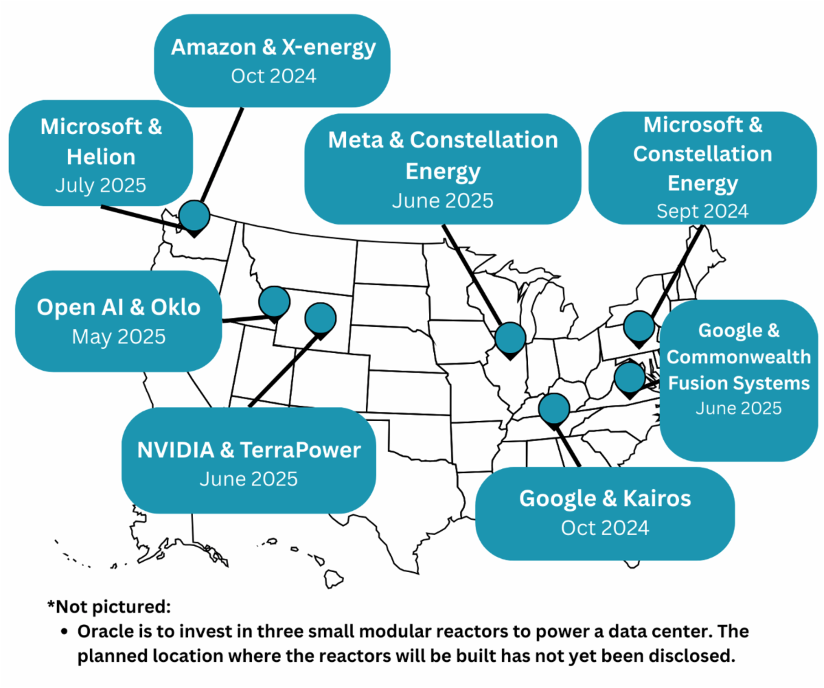 ● Google and NextEra have agreed to revive the 615 MW Duane Arnold nuclear plant in Iowa, and Google has partnered with Kairos Power, Elementl, and Commonwealth Fusion Systems.