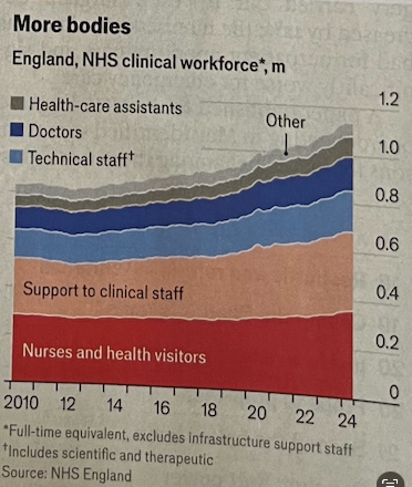 3. Productivity can be measured by the number of patients treated or the quality of outcomes. The numbers treated has risen, but some survival rates, stagnated. There’s been improvements through digitalisation, records, tele-med, NHSApp and better resource management but often overshadowed by demand.