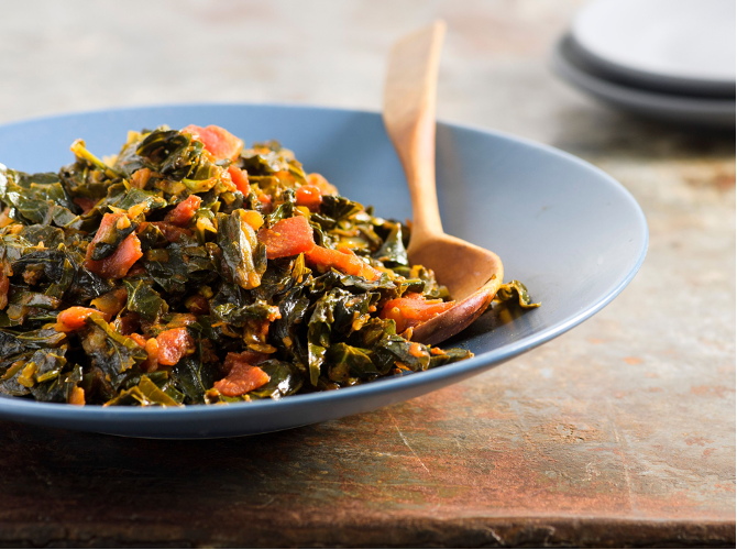 Looking for a different way to cook your collards? This recipe opts for tomato, coriander, and cumin rather than ham hock or fatback, making the collards healthier but not lacking in flavor!