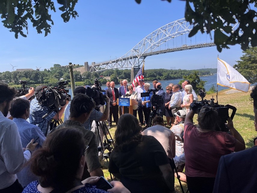 Governor Healey, Senator Markey, Senator Warren, Congressman Keating and members of the Cape Cod delegation and the Cape & Islands Bridges Coalition at the July Announcement of $993m in federal funds for replacement of the Sagamore Bridge. | |
