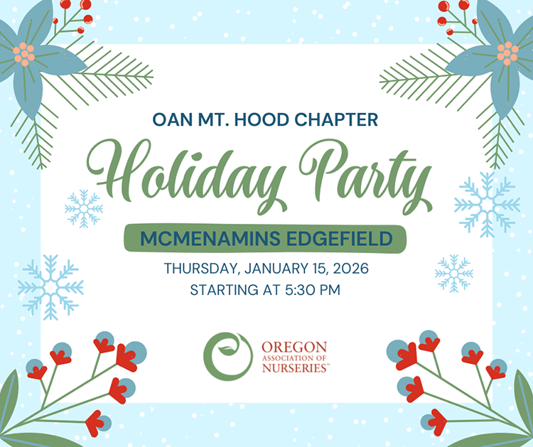 Details: There’s still time to join the Oregon Association of Nurseries Mt. Hood Chapter’s annual holiday party at 5:30 p.m. Thursday, January 15 at McMenamins Edgefield Hotel Ballroom, 2126 S.W. Halsey St., in Troutdale, Oregon.