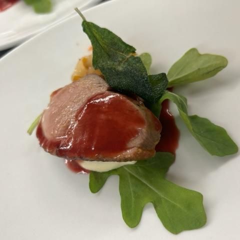 Sliced duck atop whipped parsnip, with pear relish, cherry Port wine reduction & a sprig of fried sage.