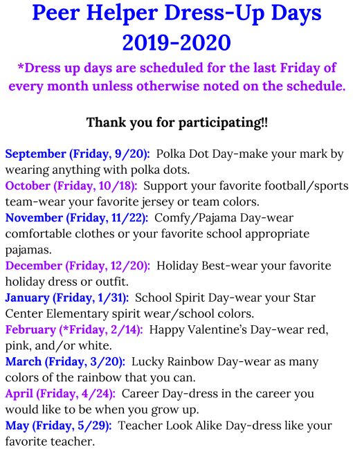 - Peer Helper Dress Up Day--Wear your favorite sports team jersey or colors