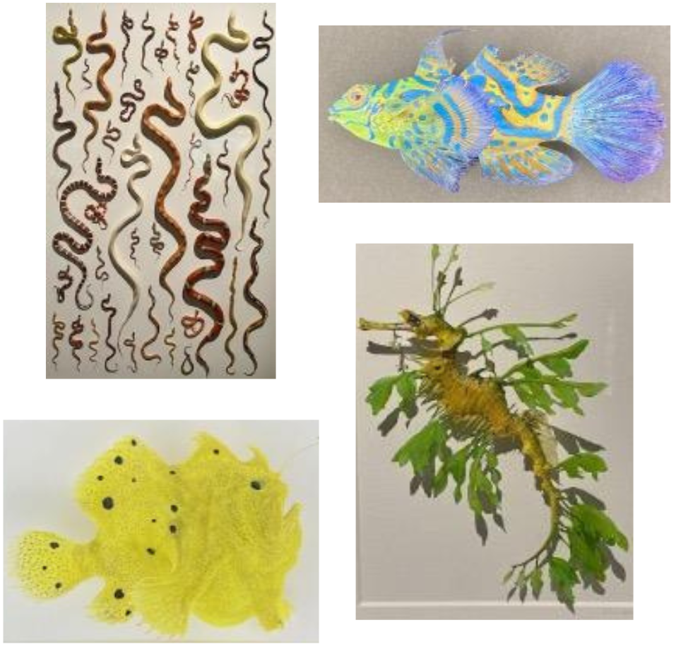 | | Christopher Marley grew up in Oregon, and while he had a particular affinity for lizards when he was young, he found a lot of other creatures creepy! His career led him to travel the world and during his days off he started to discover a love for all living things, until one day he realized he wanted to actually make that sense of awe he felt in the face of nature his life’s work. | | He recognized that many people are fearful of, or even ‘grossed out’ by insects, snakes, even his beloved lizards. He also knew that people are inherently attracted to color and pattern, so decided he would try to make the ‘creepy creatures’ more approachable by displaying them as art. He developed relationships with institutions and collectors around the world who bring him creatures that have died, or in the case of non-endangered insects, that they have collected for him. He has also developed unique ways to preserve these creatures in their natural forms and colors - quite the challenge for the larger species he works with. | | He then creates art using these specimens, sometimes just one remarkable creature, sometimes using hundreds to create patterns or color gradients. His work is so stunningly beautiful that he has authored several books featuring it: Pheromone was the first, focused on insects; Biophilia, which became a New York Times bestseller; and now Exquisite Creatures, the most complete book of his work and the accompaniment to a travelling exhibition. Most importantly for all of you - the exhibit is currently running in Seattle! I had the absolute delight to see it a couple of weeks ago and while I know this is supposed to be a book review, I loved the exhibit so much I wanted you all to know about it. All of the photos here were taken by me of his remarkable work. | “If one truly loves nature one finds beauty everywhere.” Vincent Van Gogh | |