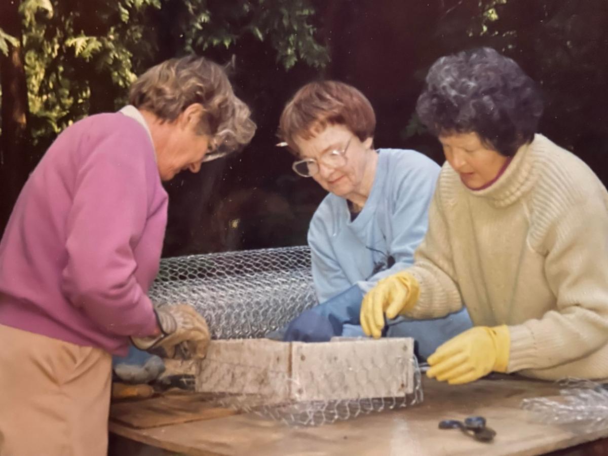 The album’s first recorded craft workshop was making troughs. This picture features Hazel O’Brien, Heather O’Malley and Birgette Sofaer in 1991. The first Garden Faire was in 1993 and the first Garden Tour was in 2005. Those dozen years were the glory days for garden craft workshops. See how many active GC members you can find!