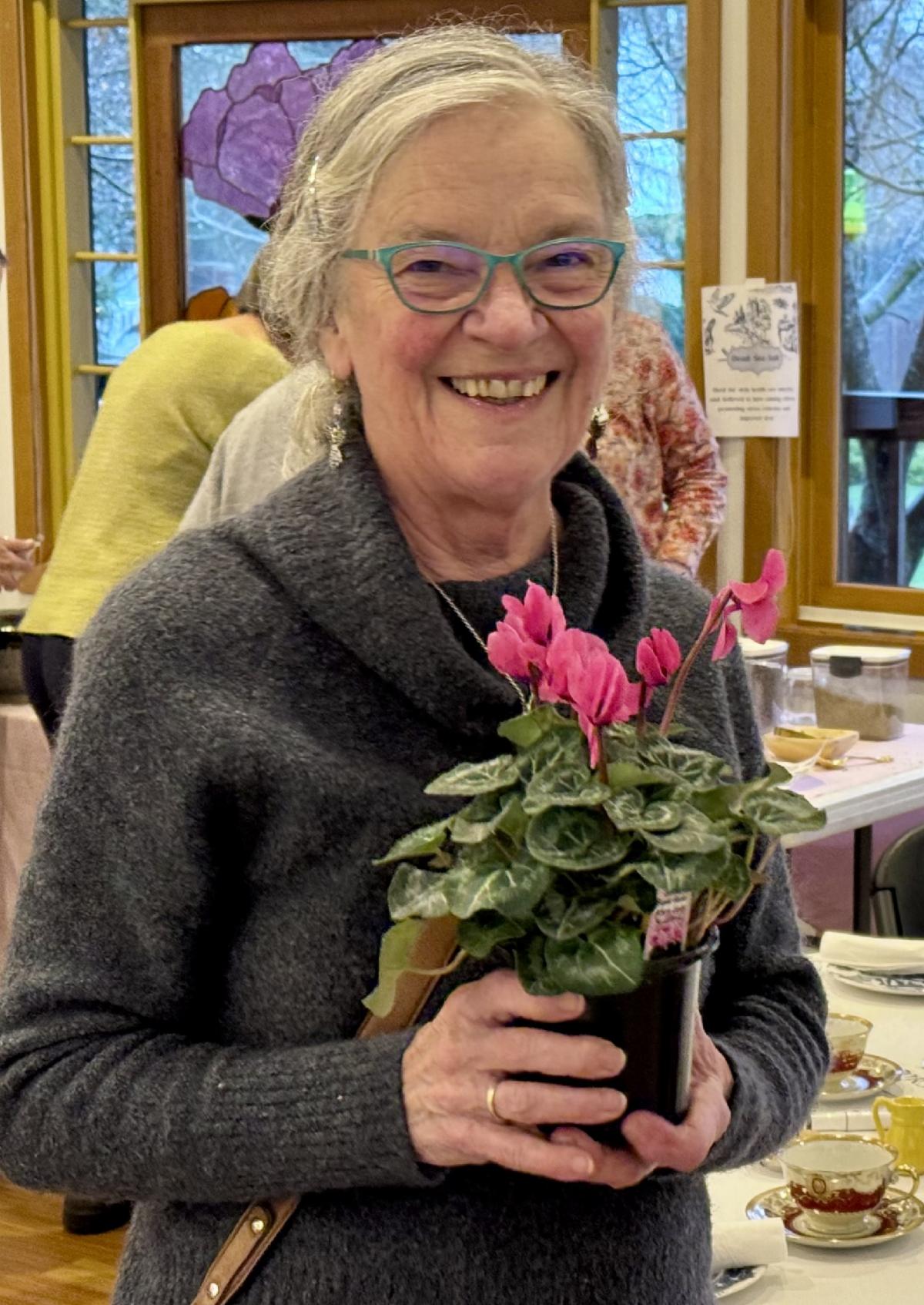Our December lucky door prize winner was Jenny who won a beautiful vibrant pink cyclamen. All who attended the holiday meeting were treated to take home their own personally curated bath salts so we were all winners in December! Lucky us! | At each monthly meeting, all guests joining us in person are entered for a chance to to win a door prize! | |