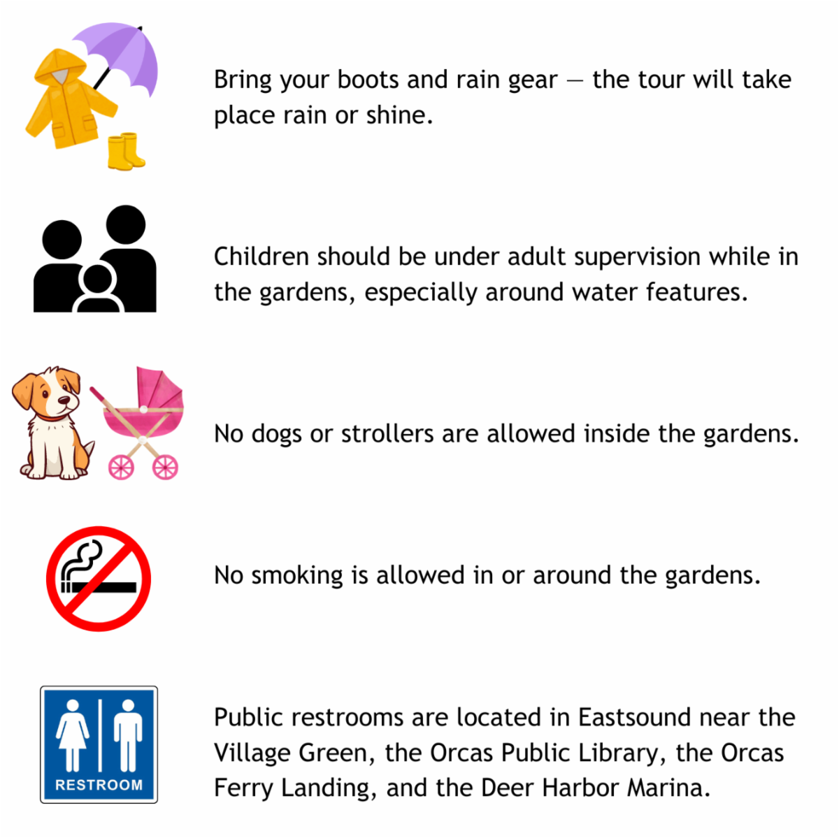 Here are a few reminders to help you prepare for a successful visit to the Garden Tour!