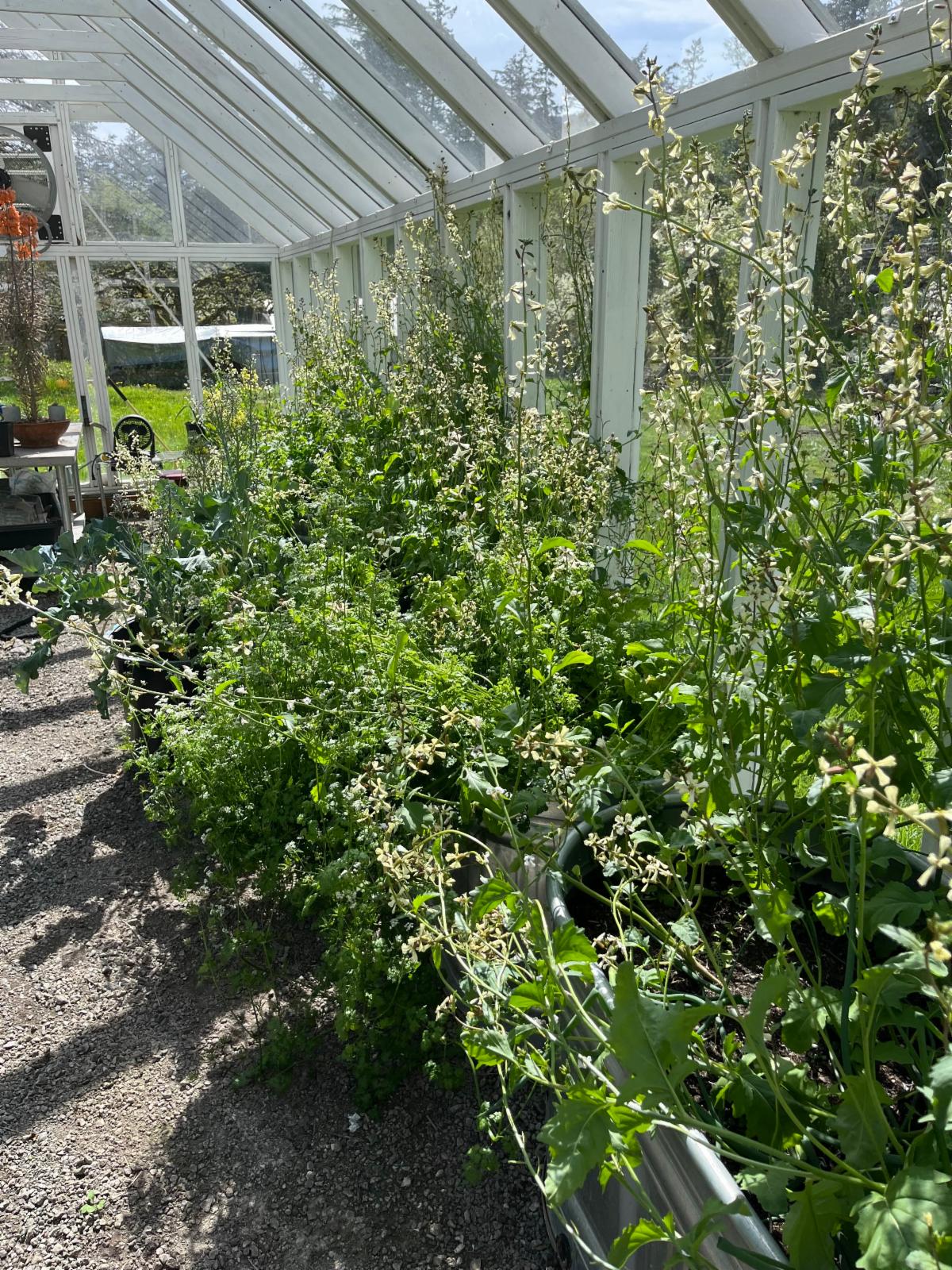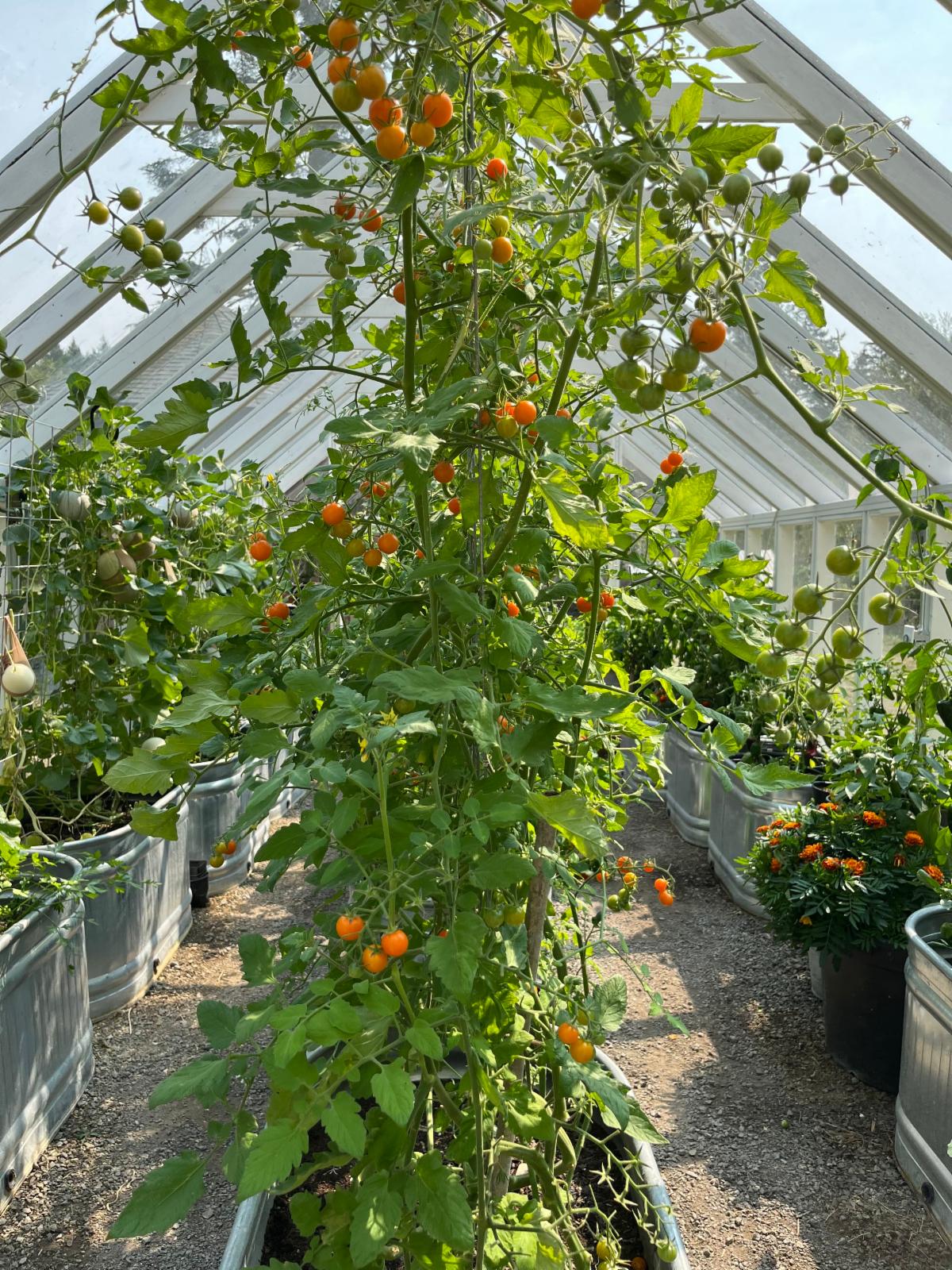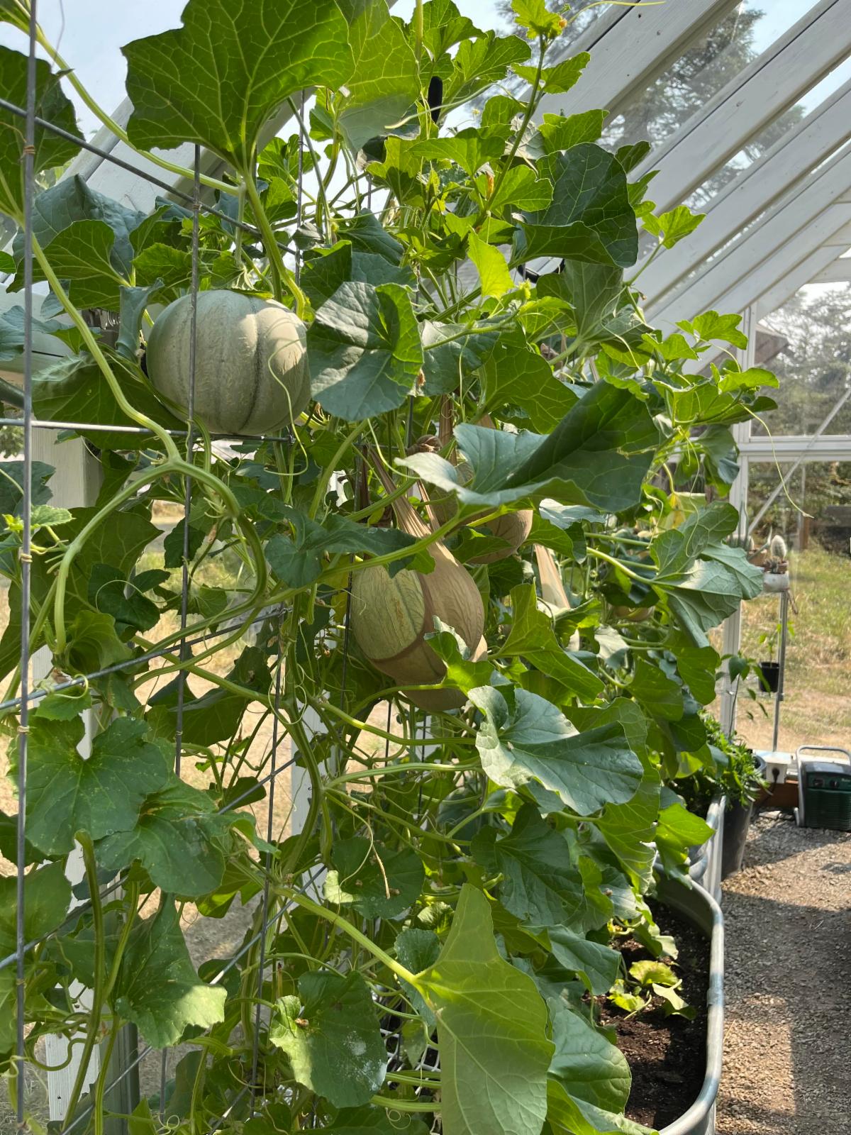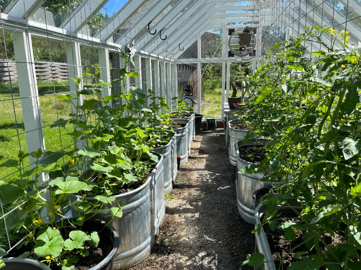 My husband Chis built our greenhouse in 2020 after spending a year walking our property to find the perfect spot. The greenhouse is 12x30 acclimated north to south and made out of recycled cedar decking and glass. It has a gravel floor, minimal heat, fans and windows that open at both ends. We plant in galvanized tubs and change the soil completely every 2-3 years and add compost yearly. We start seeds in the winter/spring and grow the plants on until outdoor planting or the melons, peppers and some tomatoes stay in the greenhouse. This fall/winter I grew salad greens that provided enough for daily salads. Chris has taken a keen interest in hot sauce, so he grows 4-6 varieties of hot peppers every year. Plus, lots of shishito peppers! And the melons are a special treat- the scent in the summer as they ripen is delightful.