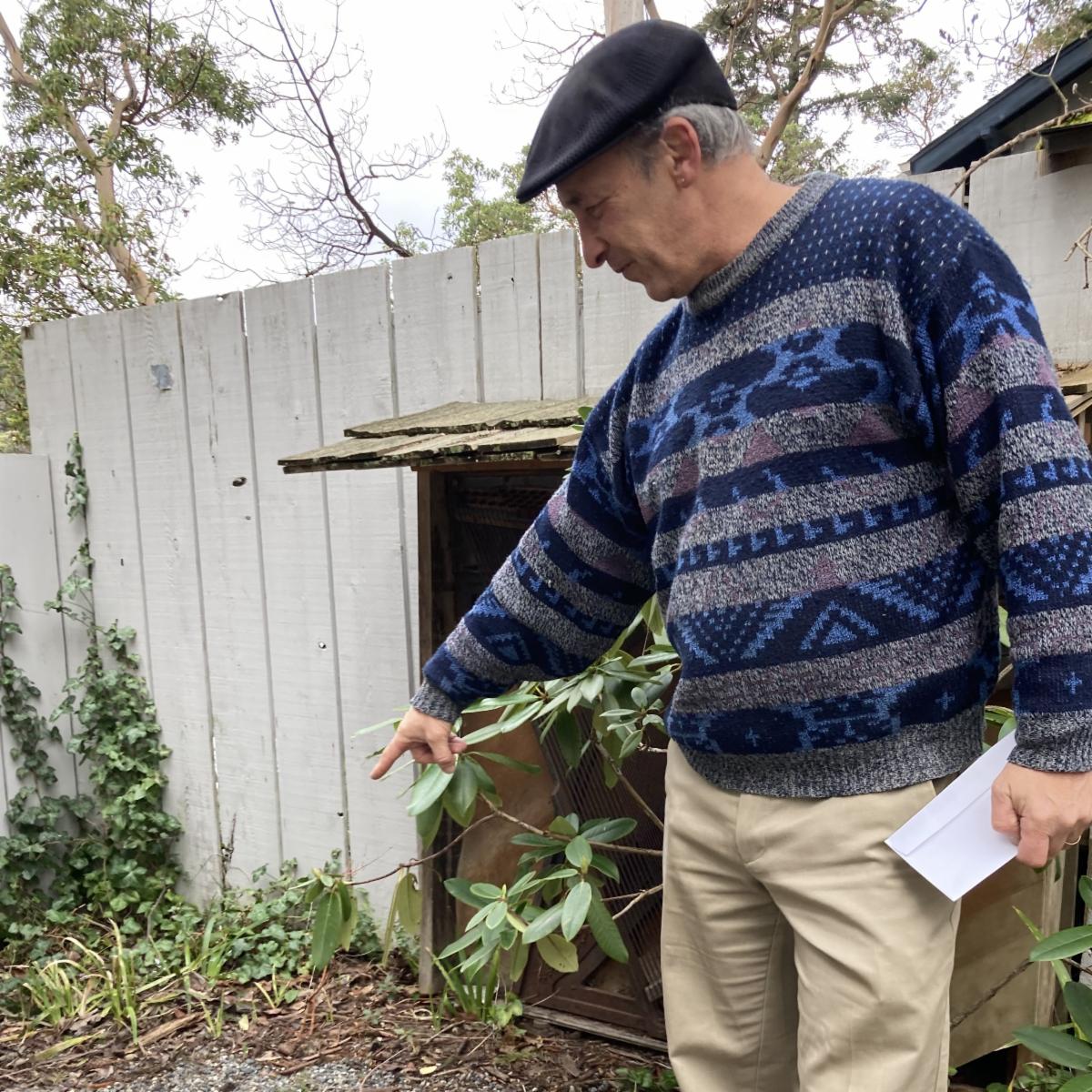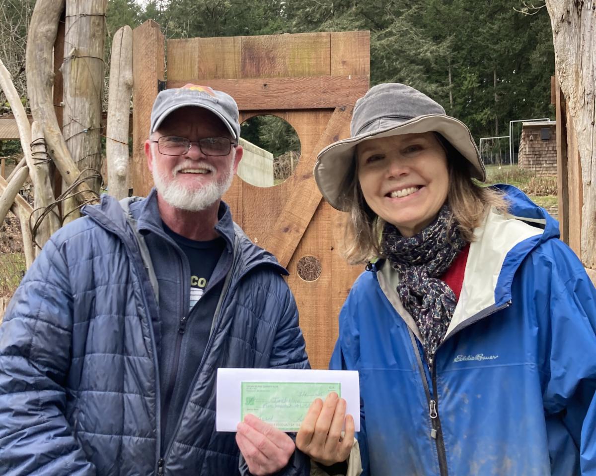 | | The Odd Fellows plan to use the grant to help beautify the Eastsound village and Odd Fellows Community Hall with vibrant plants. Led by Robin Kucklick, volunteers will put in planters, spring flowers, annuals, and perennials along with soil amendments. Learn more about Odd Fellows Hall and Organization | Pictured: Didier, Hall Manager of Odd Fellows, accepts the $500 grant award | Pictured: Didier shows the landscaping improvements he plans to make | | The Indralaya Theosophical Center project goal is a vegetable restoration project. They plan to incorporate various strategies to rodent-proof their raised garden beds. The food produced will serve program participants with any surplus donated to the Orcas Island Food Bank. Learn more about Indralaya Theosophical Center | Pictured: Sharon James, Garden Steward, and Alec Grae, Camp Manager, accepts the $500 grant award | Pictured: Sharon explains non-lethal strategies to deter rats and voles | | Can't Get Enough of Citizen Science? | | |