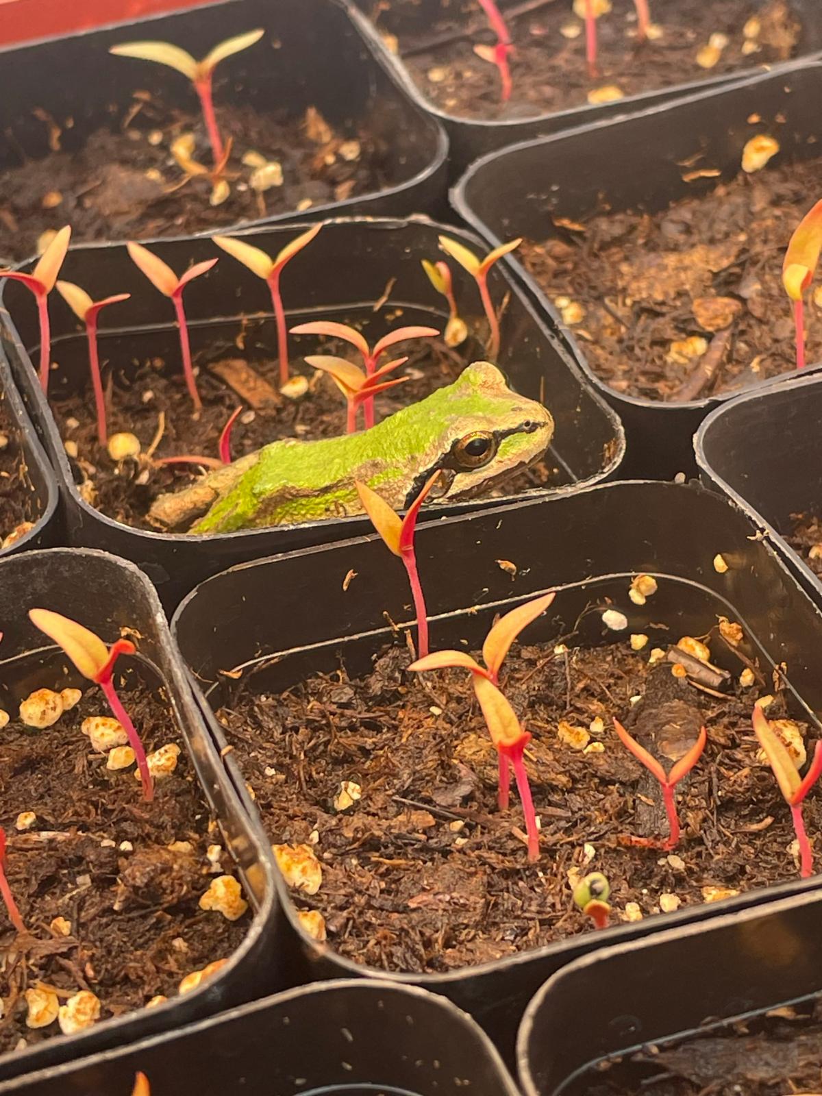Says the greenhouse resident frog, "It's pretty cozy hanging out here. Can I just stay for a bit under your growing lights and appreciate the seedlings? It's pretty comfortable here...