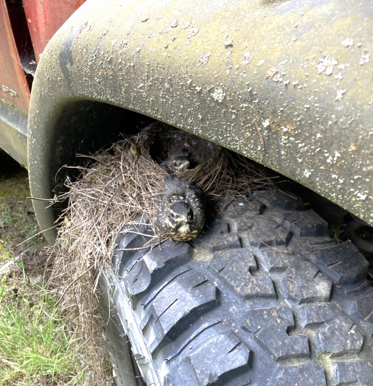 Just approaching Mother's Day, OIGC member, Perri, discovered a beautiful family of Robin Fledglings, nestled under her son's old Jeep that were about to leave the nest.