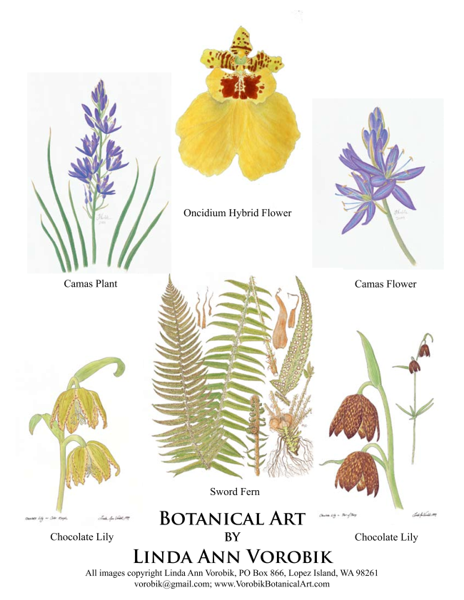 Linda Ann Vorobik, botanist, editor, and illustrator of numerous botanical publications, cherishes all three west coast states as home. She holds a PhD in Biology from the University of Oregon, conducts field research and teaches in the Siskiyou Mountains and at other sites. She has lived on Lopez Island since 1993, and is affiliated with the Santa Barbara Botanic Garden, and the herbarium collections at UC Berkeley and UW Seattle.