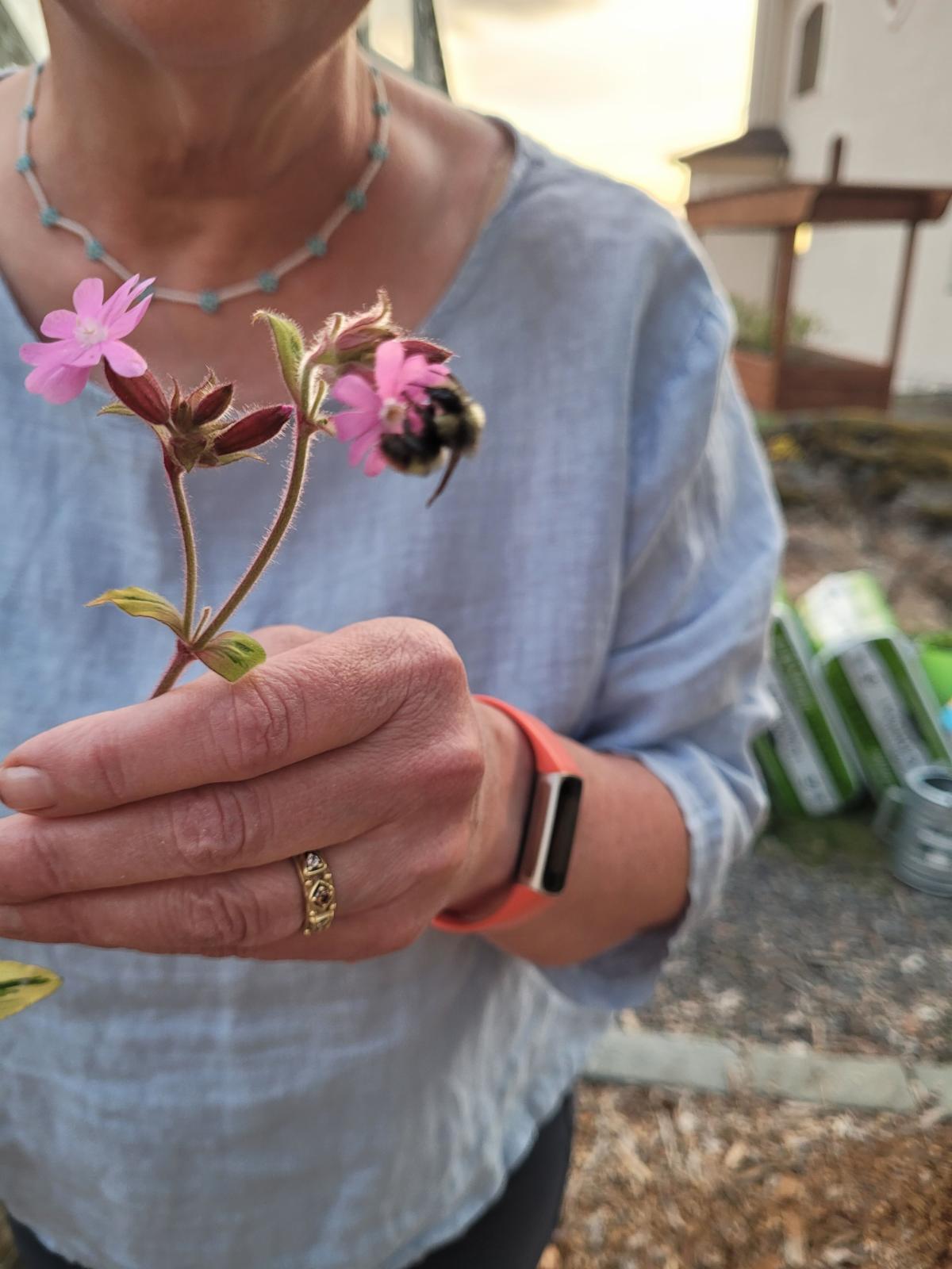 | | | | Later the following week, a weary and darling little Bombus vosnesenskii or commonly known as a Yellowfaced Bumble Bee, trapped inside my greenhouse, bumped against the glass in frustration hoping to find an exit. I could tell it was tiring and it’s confidence fading. I always keep a couple of bee favorite perennials blooming outside my greenhouse door just for this occasion! I grabbed a stem with a fresh, open bloom with a nice landing platform and carefully targeted the little guy. Within a few moments, the creature took one wobbly step and then another and when most of his weight pitched onto the bloom and I carefully lift him to safety. I freed him into a space filled with lots of choices and I’m sure he was relieved. My heart sang a little. | | |