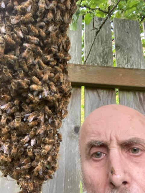 "One of my hives swarmed yesterday" Tony said, "Here's a photo of me trying to figure out how to capture the swarm."