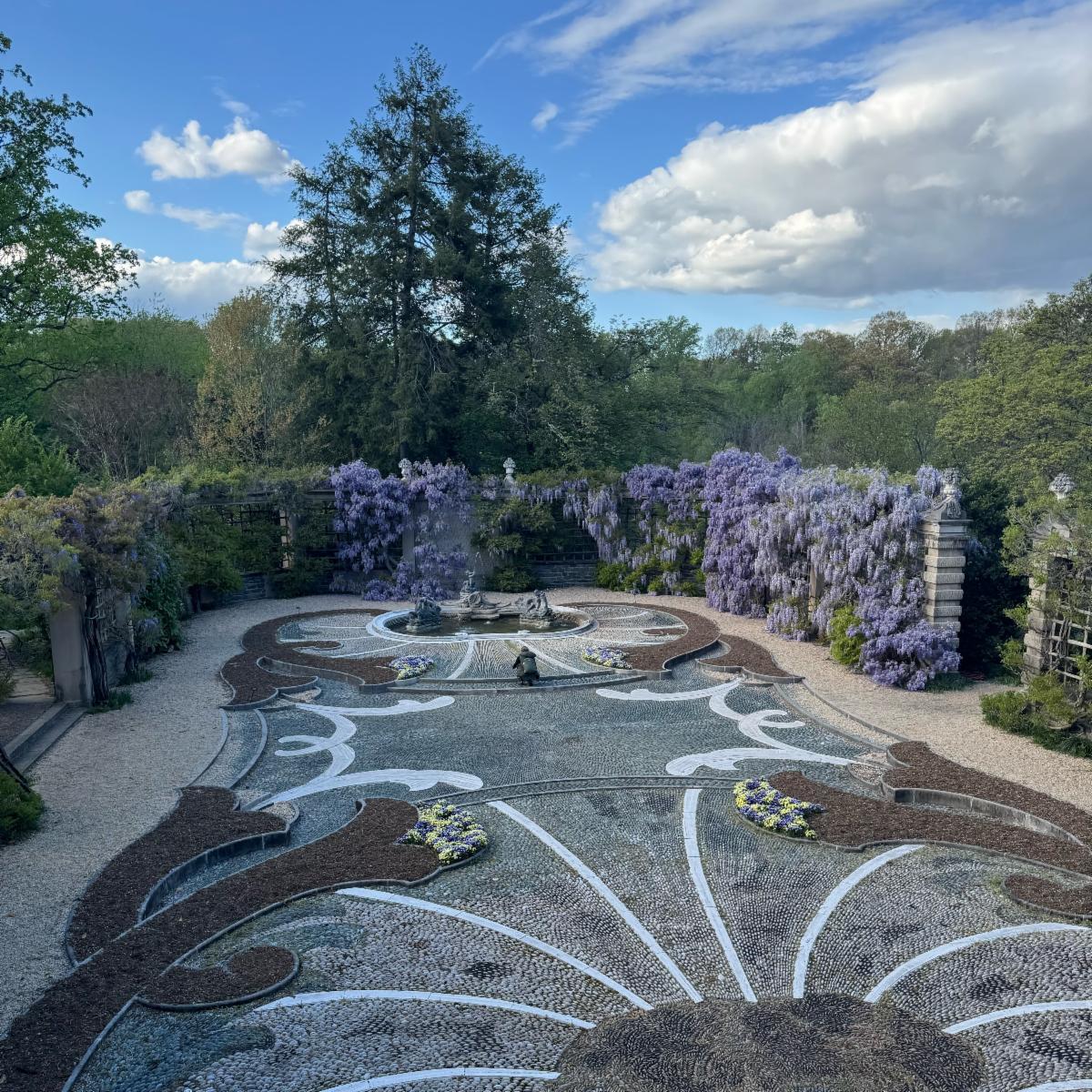 The Pebble Garden is a rectangular area enclosed by wisteria-draped walls which were in full bloom in April. The pebbles were imported from Mexico. The curved limestone edgings enclose beds of thyme and sedum. At the southern end of the garden are carved limetone cornucopias flanking the central pebble pattern of a wheat sheaf. Set in stone below is the Bliss family motto: “Quod Severis Metes” (As ye sow, so shall ye reap).