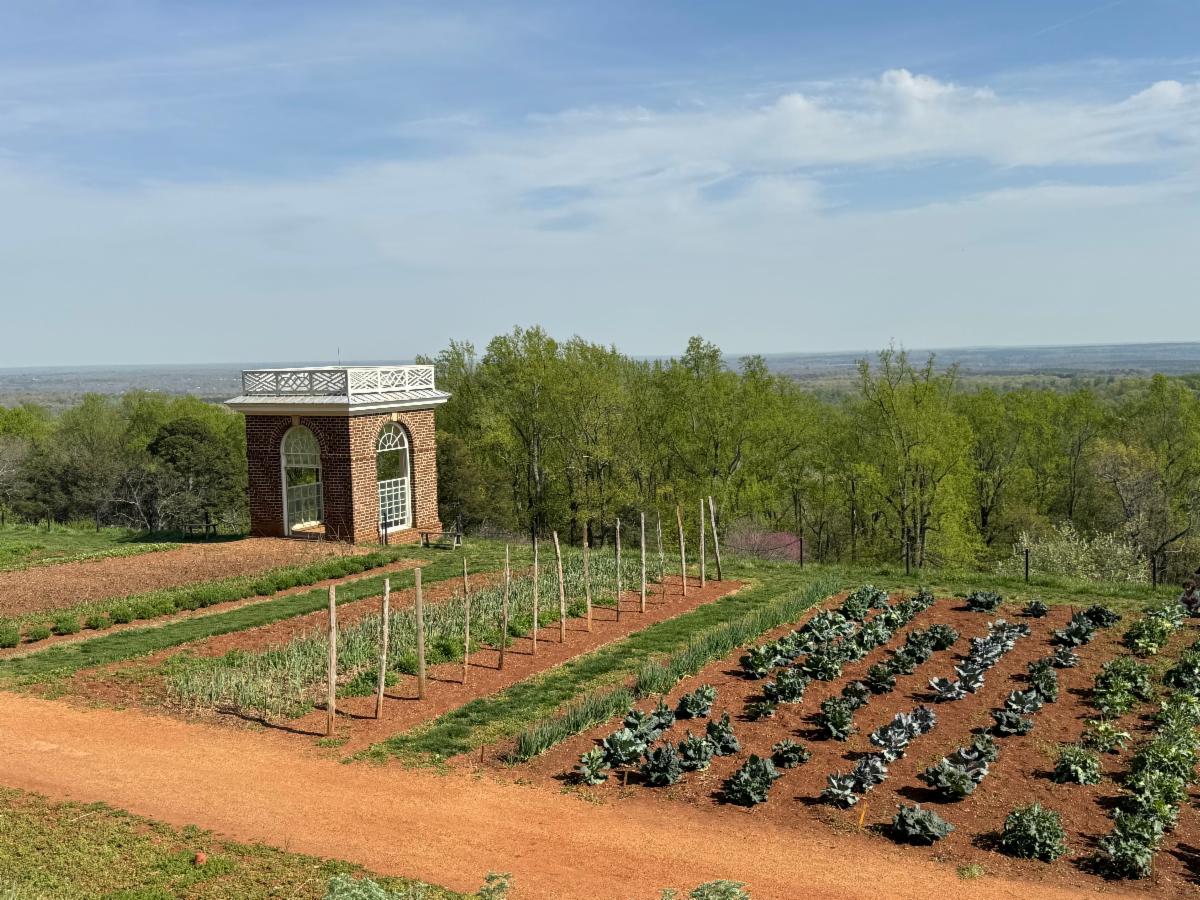 The Vegetable Garden is a 1,000-foot-long garden terrace where Jefferson grew 330 vegetable varieties. At the halfway point of the garden, is the garden pavilion that was used by Jefferson as a quiet retreat where he could read in the evening. It overlooks an eight-acre orchard of 300 trees, a vineyard, and Monticello’s berry squares, which are plots of figs, currants, gooseberries, and raspberries. The main part of the two-acre garden is divided into twenty-four “squares” or growing plots and in 1812, the squares were arranged according to which part of the plant was being harvested: fruits (tomatoes, beans), roots (beets, carrots), or leaves (lettuce, cabbage).