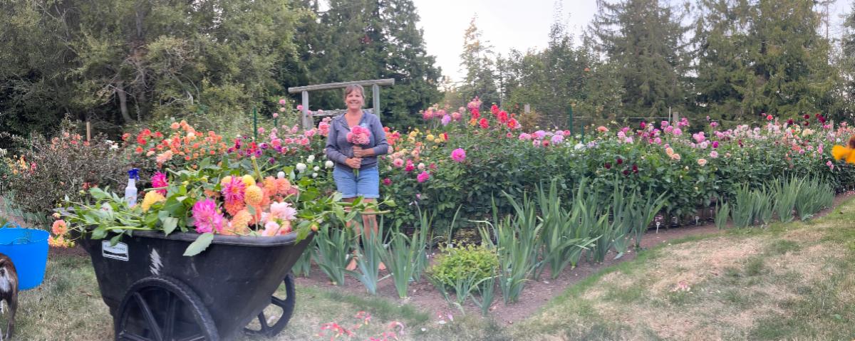 | | | Robin Sullivan - This was a summer of first’s for me in the garden and as always I learned a lot both from my mistakes and my successes. I never would have imagined myself growing Dahlias, but one of the best garden cheerleaders I know encouraged me to go to the Seattle Garden Show and there I discovered the true wonder of dahlias. On our return to Orcas, my garden muse taught me how to protect my corms and when the time was right, how to start them gently in a greenhouse. I was very skeptical of this process as every time I checked on them there didn't seem to be any signs of life. Finally, when it looked like a few leaves had sprung up, i excitedly took them home and planted them front and center in my garden watching and waiting for them to bloom. After a slug invasion nearly devoured every tender green shoot, I once again watched and waited as the stems fought back with surprising strength. Finally, the day came when my humble corms grew into towering bursts of color. Each flower that now opens is more than just beauty—it’s a little victory, a reminder that even the smallest triumphs in the garden can feel like miracles.