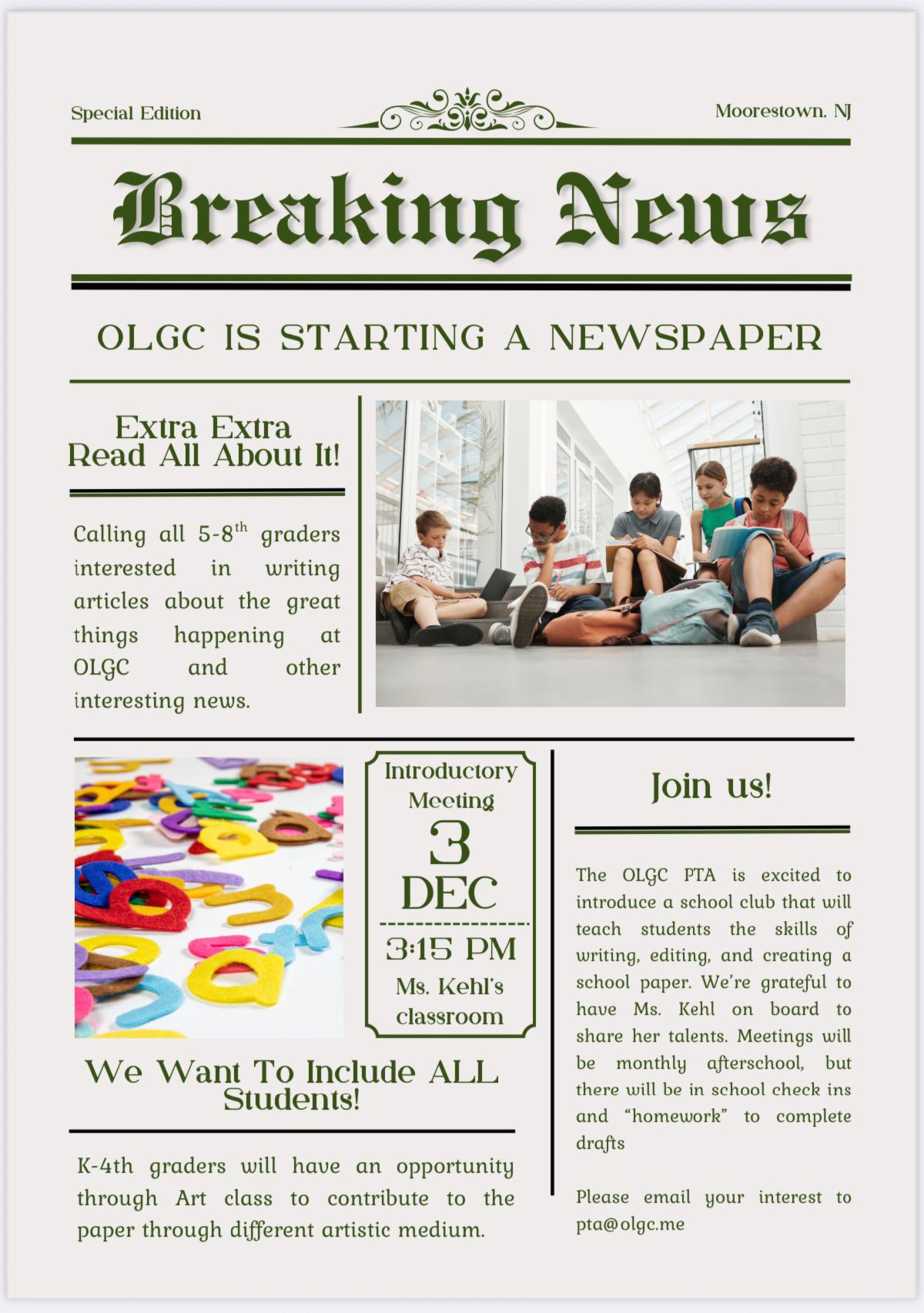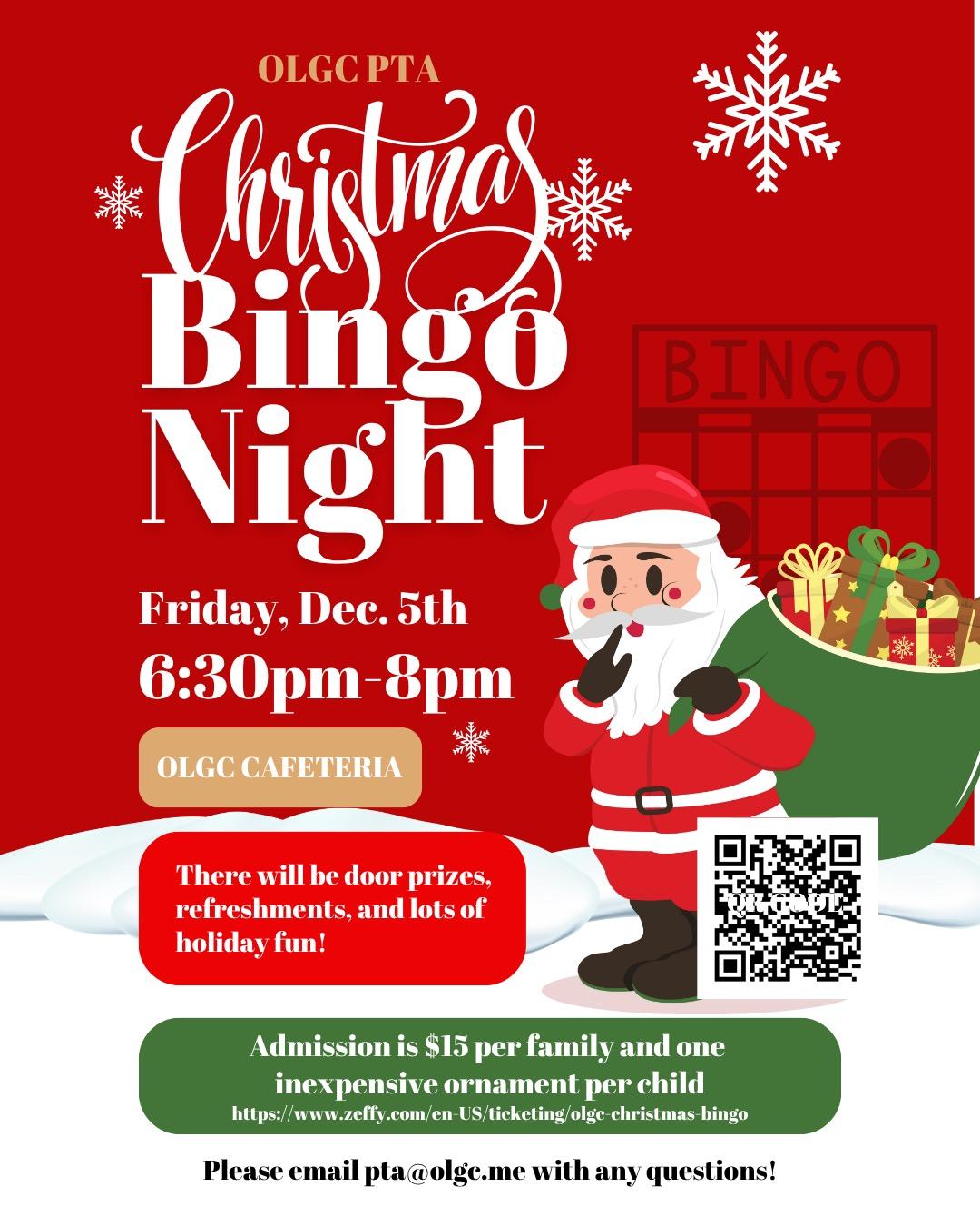 Kick off the holiday season at the OLGC PTA’s Family Christmas Bingo Night Friday, December 5th! There will be door prizes, refreshments and lots of holiday fun! Tickets are on sale now!